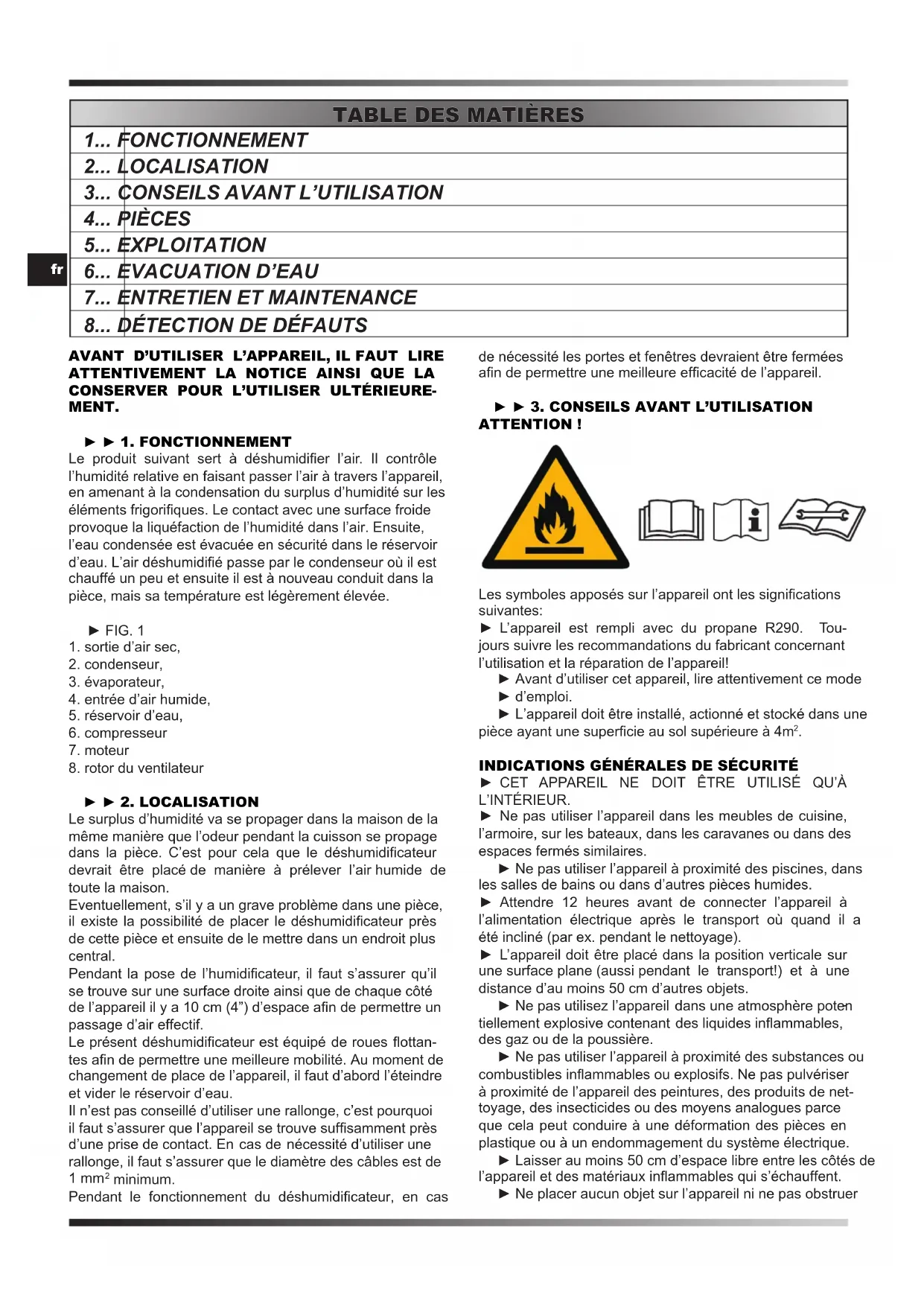 MENT. ► ► 1. FONCTIONNEMENT Le produit suivant sert à déshumidier l’air. Il contrôle l’humidité relative en faisant passer l’air à travers l’appareil, en amenant à la condensation du surplus d’humidité sur les éléments frigoriques. Le contact avec une surface froide provoque la liquéfaction de l’humidité dans l’air. Ensuite, l’eau condensée est évacuée en sécurité dans le réservoir d’eau. L’air déshumidié passe par le condenseur où il est chauffé un peu et ensuite il est à nouveau conduit dans la pièce, mais sa température est légèrement élevée. ► FIG. 1