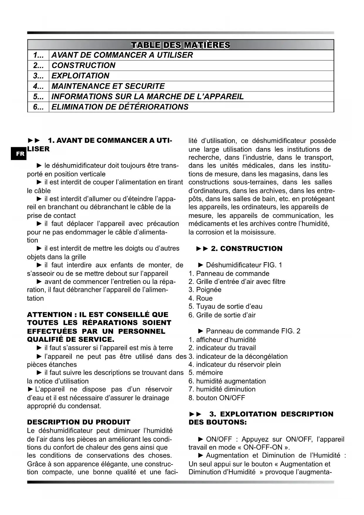 Le déshumidicateur peut diminuer l’humidité de l’air dans les pièces an améliorant les condi- tions du confort de chaleur des gens ainsi que les conditions de conservations des choses. Grâce à son apparence élégante, une construc- tion compacte, une bonne qualité et une faci- lité d’utilisation, ce déshumidicateur possède une large utilisation dans les institutions de recherche, dans l’industrie, dans le transport, dans les unités médicales, dans les institu- tions de mesure, dans les magasins, dans les constructions sous-terraines, dans les salles d’ordinateurs, dans les archives, dans les entre- pôts, dans les salles de bain, etc. en protégeant les appareils, les ordinateurs, les appareils de mesure, les appareils de communication, les médicaments et les archives contre l’humidité, la corrosion et la moisissure. ► 2. CONSTRUCTION ► Déshumidicateur FIG. 1