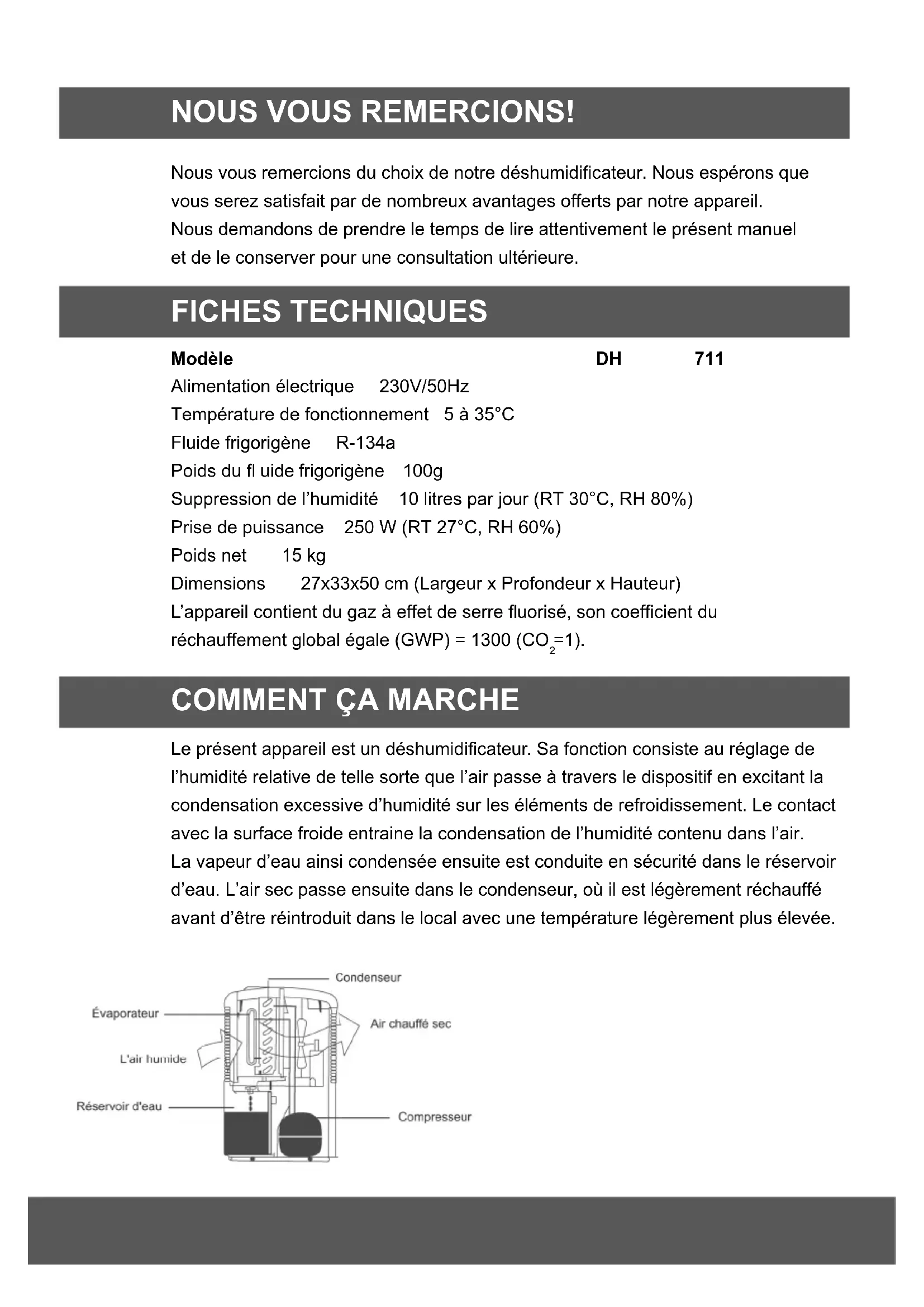 - Onko lattia laitteen asetuspaikassa tasainen? Ei saa korjata tai purkaa laitetta omaehtoisesti.Nous vous remercions du choix de notre déshumidifi cateur. Nous espérons que vous serez satisfait par de nombreux avantages offerts par notre appareil. Nous demandons de prendre le temps de lire attentivement le présent manuel et de le conserver pour une consultation ultérieure. Le présent appareil est un déshumidifi cateur. Sa fonction consiste au réglage de l’humidité relative de telle sorte que l’air passe à travers le dispositif en excitant la condensation excessive d’humidité sur les éléments de refroidissement. Le contact avec la surface froide entraine la condensation de l’humidité contenu dans l’air. La vapeur d’eau ainsi condensée ensuite est conduite en sécurité dans le réservoir d’eau. L’air sec passe ensuite dans le condenseur, où il est légèrement réchauffé avant d’être réintroduit dans le local avec une température légèrement plus élevée. Modèle DH 711 Alimentation électrique 230V/50Hz Température de fonctionnement 5 à 35°C Fluide frigorigène R-134a Poids du fl uide frigorigène 100g Suppression de l’humidité 10 litres par jour (RT 30°C, RH 80%) Prise de puissance 250 W (RT 27°C, RH 60%) Poids net 15 kg Dimensions 27x33x50 cm (Largeur x Profondeur x Hauteur) L’appareil contient du gaz à effet de serre fl uorisé, son coeffi cient du réchauffement global égale (GWP) = 1300 (CO