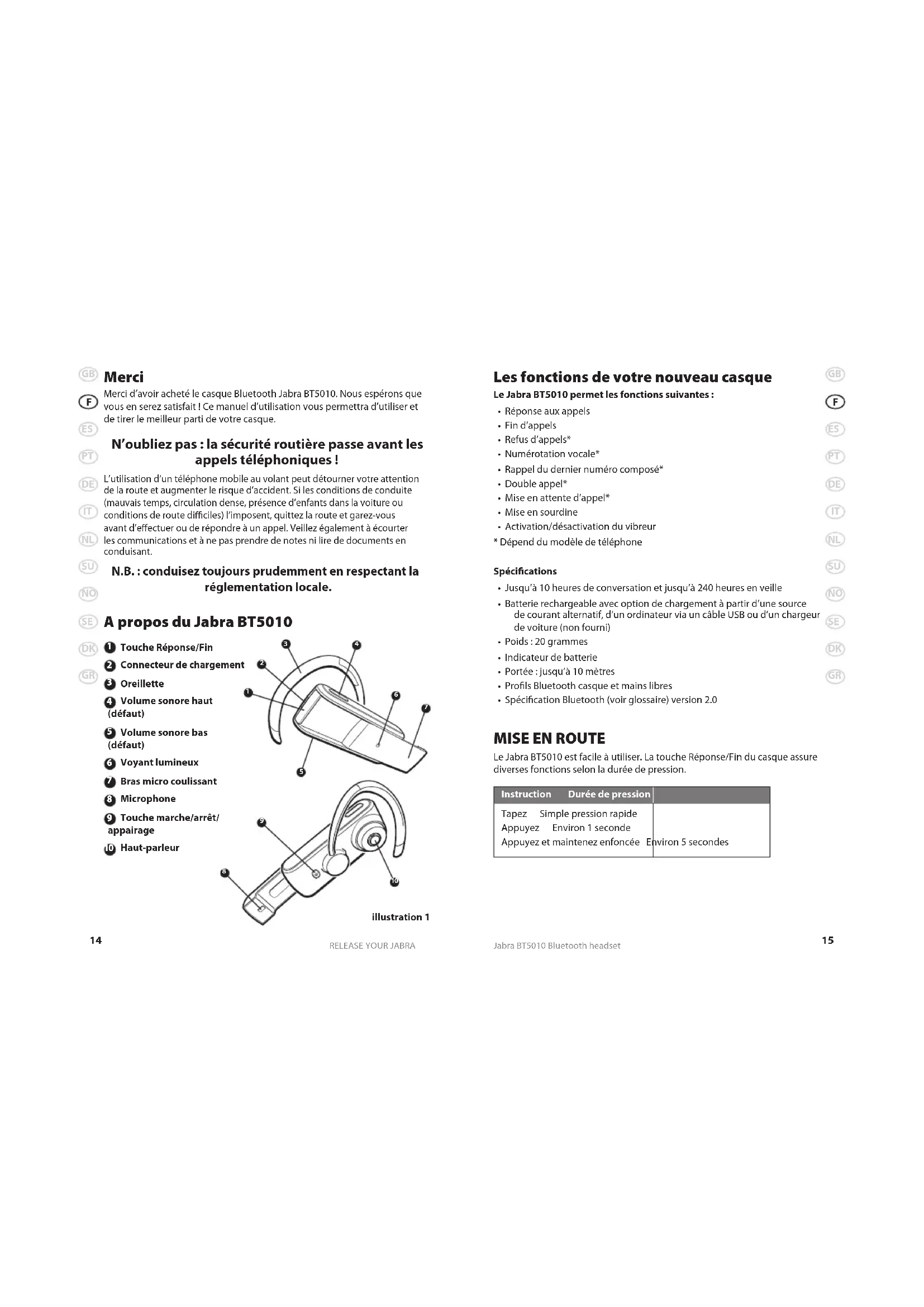 Ce produit porte le marquage CE conformément aux dispositions de la Directive 1999/5/CE (R&TTE). GN Netcom déclare par la présente que ce produit est conforme aux principales exigences et autres dispositions pertinentes de la Directive 1999/5/CE. Pour de plus amples informations, nous vous invitons à visiter le site www.jabra.com Dans l’UE, ce dispositif est utilisable dans les pays suivants : Autriche, Belgique, Chypre, République tchèque, Danemark, Estonie, Finlande, France, Allemagne, Grèce, Hongrie, Irlande, Italie, Lettonie, Lituanie, Luxembourg, Malte, Pologne, Portugal, Slovaquie, Slovénie, Espagne, Suède, Pays Bas, Royaume-Uni, et dans les pays de l’AELE : Islande, Norvège et Suisse. Bluetooth La marque et le logo Bluetooth® sont la propriété de Bluetooth SIG, Inc. et toute utilisation de telles marques par GN Netcom est sous licence. Toutes autres marques et dénominations commerciales appartiennent à leurs propriétaires respectifs.RELEASE YOUR JABRA