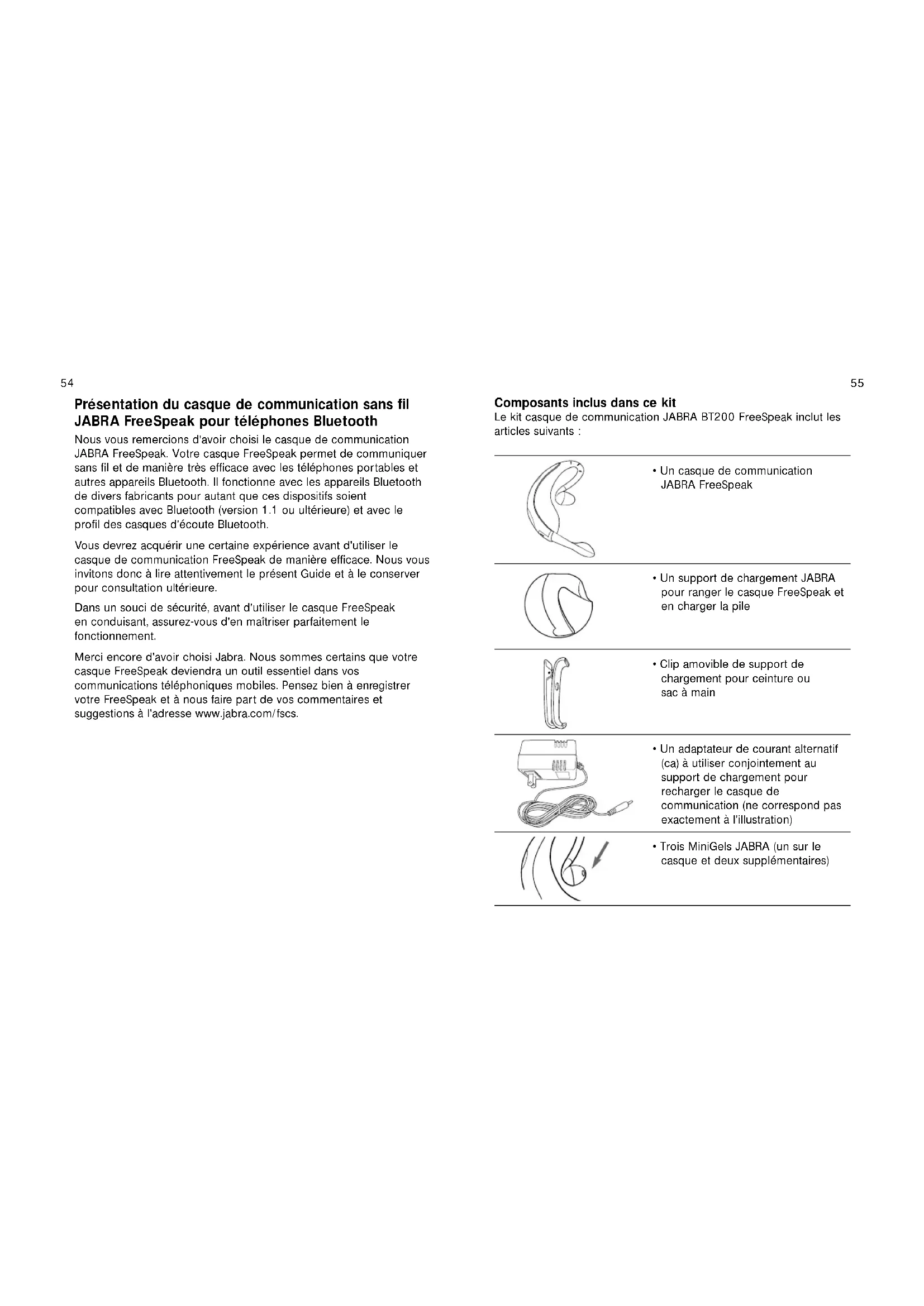 outre, les signaux sans fil Bluetooth utilisent nettement moins de puissance que ceux d'un téléphone portable traditionnel. Ils sont par conséquent beaucoup plus difficilement détectables par des personnes malintentionnées. Quelle est la puissance de fréquence radio La puissance du signal radio d'un portable traditionnel est environ cent fois plus élevée que celle du casque de communication FreeSpeak. Puis-je porter mon casque FreeSpeak dans la douche ou sous la pluie ? Le système FreeSpeak N'EST PAS étanche. Ne portez en aucun cas le casque sous la douche ou la pluie. Le contact avec l'eau risque en effet d'endommager le produit. Que signifie ce bip dans mon oreille ? Un bip peut être émis par ou provenir de plusieurs sources. Il peut s'agir par exemple d'un indicateur de votre téléphone/service mobile indiquant un appel en attente ou que la pile est presque épuisée. Vous entendrez également un bip lorsque la batterie du casque de communication JABRA est presque épuisée. Ce dernier bip est en fait une brève série de tonalités décrites dans la section Signification des indicateurs FreeSpeak du présent document. Rien ne marche ; que faire ? En cas de problème, reportez-vous tout d'abord à la section Dépannage de ce Guide. Si aucun des suggestions n'a d'effet, visitez le site web www.jabra.com/fscs où vous trouverez les toutes dernières informations d'assistance clientèle, ou contactez-nous de l'une de manières proposées ci-dessous. Le système FreeSpeak est-il compatible avec les PC, les portables et les PDA ? Le casque FreeSpeak fonctionne avec tous les appareils compatibles avec les normes Bluetooth (version 1.1) et incluant le profil « casque ». Les premiers fabricants de ces appareils inclurent de nombreuses mar- ques de téléphone cellulaire et certaines marques de PDA (Personal Digital Assistant). À mesure de la popularisation de la norme Bluetooth, de plus en plus de marques prendront en charge les implémentations de profil « casque » Bluetooth. FreeSpeakManualALLBT9/19/02 9/19/02 11:50 AM Page 7473