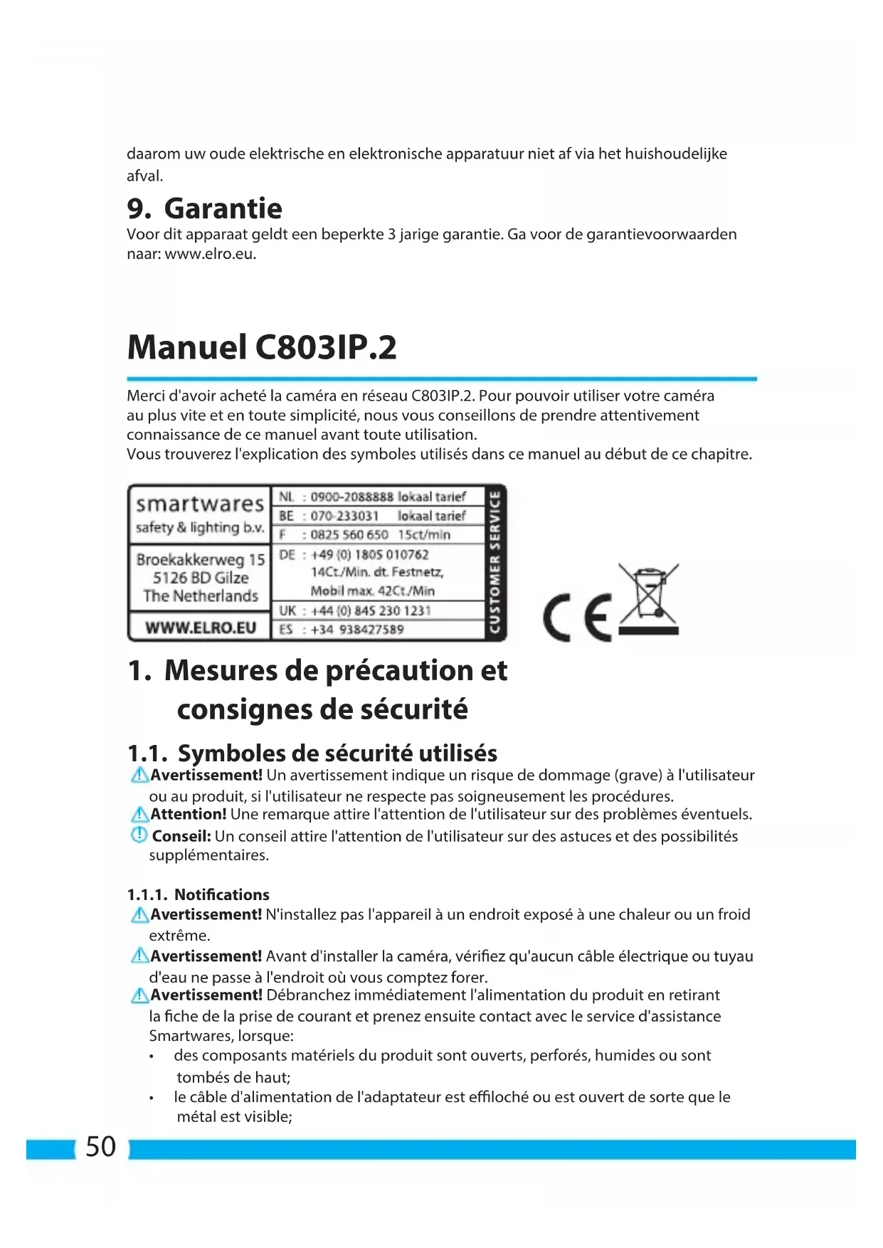 Voor dit apparaat geldt een beperkte 3 jarige garantie. Ga voor de garantievoorwaarden naar: www.elro.eu. Manuel C803IP.2 Merci d'avoir acheté la caméra en réseau C803IP.2. Pour pouvoir utiliser votre caméra au plus vite et en toute simplicité, nous vous conseillons de prendre attentivement connaissance de ce manuel avant toute utilisation. Vous trouverez l'explication des symboles utilisés dans ce manuel au début de ce chapitre.