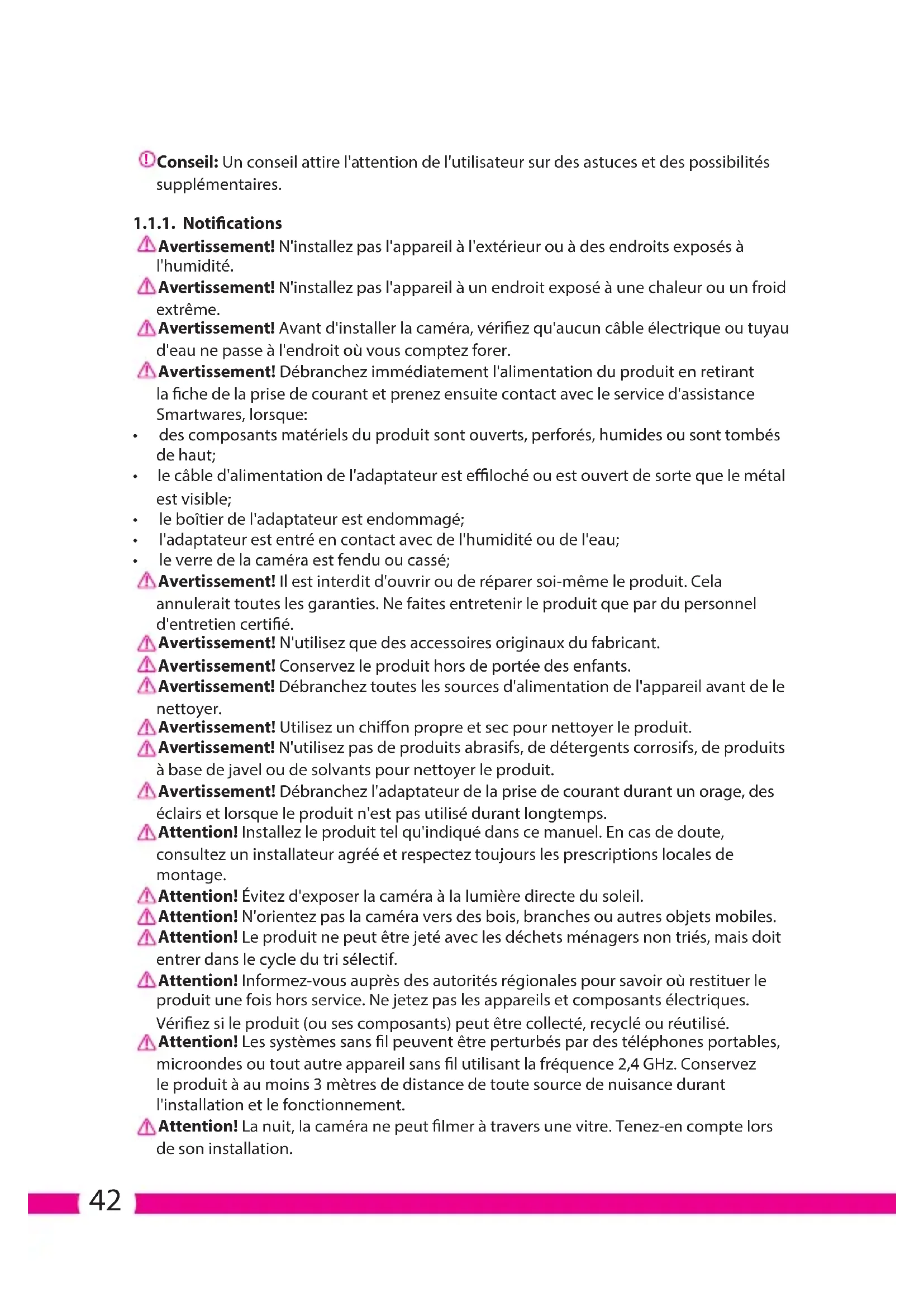 - le verre de la caméra est fendu ou cassé; Avertissement! Il est interdit d'ouvrir ou de réparer soi-même le produit. Cela annulerait toutes les garanties. Ne faites entretenir le produit que par du personnel d'entretien certié. Avertissement! N'utilisez que des accessoires originaux du fabricant. Avertissement! Conservez le produit hors de portée des enfants. Avertissement! Débranchez toutes les sources d'alimentation de l'appareil avant de le nettoyer. Avertissement! Utilisez un chion propre et sec pour nettoyer le produit. Avertissement! N'utilisez pas de produits abrasifs, de détergents corrosifs, de produits à base de javel ou de solvants pour nettoyer le produit. Avertissement! Débranchez l'adaptateur de la prise de courant durant un orage, des éclairs et lorsque le produit n'est pas utilisé durant longtemps. Attention! Installez le produit tel qu'indiqué dans ce manuel. En cas de doute, consultez un installateur agréé et respectez toujours les prescriptions locales de montage. Attention! Évitez d'exposer la caméra à la lumière directe du soleil. Attention! N'orientez pas la caméra vers des bois, branches ou autres objets mobiles. Attention! Le produit ne peut être jeté avec les déchets ménagers non triés, mais doit entrer dans le cycle du tri sélectif. Attention! Informez-vous auprès des autorités régionales pour savoir où restituer le produit une fois hors service. Ne jetez pas les appareils et composants électriques. Vériez si le produit (ou ses composants) peut être collecté, recyclé ou réutilisé. Attention! Les systèmes sans l peuvent être perturbés par des téléphones portables, microondes ou tout autre appareil sans l utilisant la fréquence 2,4 GHz. Conservez le produit à au moins 3 mètres de distance de toute source de nuisance durant l'installation et le fonctionnement. Attention! La nuit, la caméra ne peut lmer à travers une vitre. Tenez-en compte lors de son installation.43