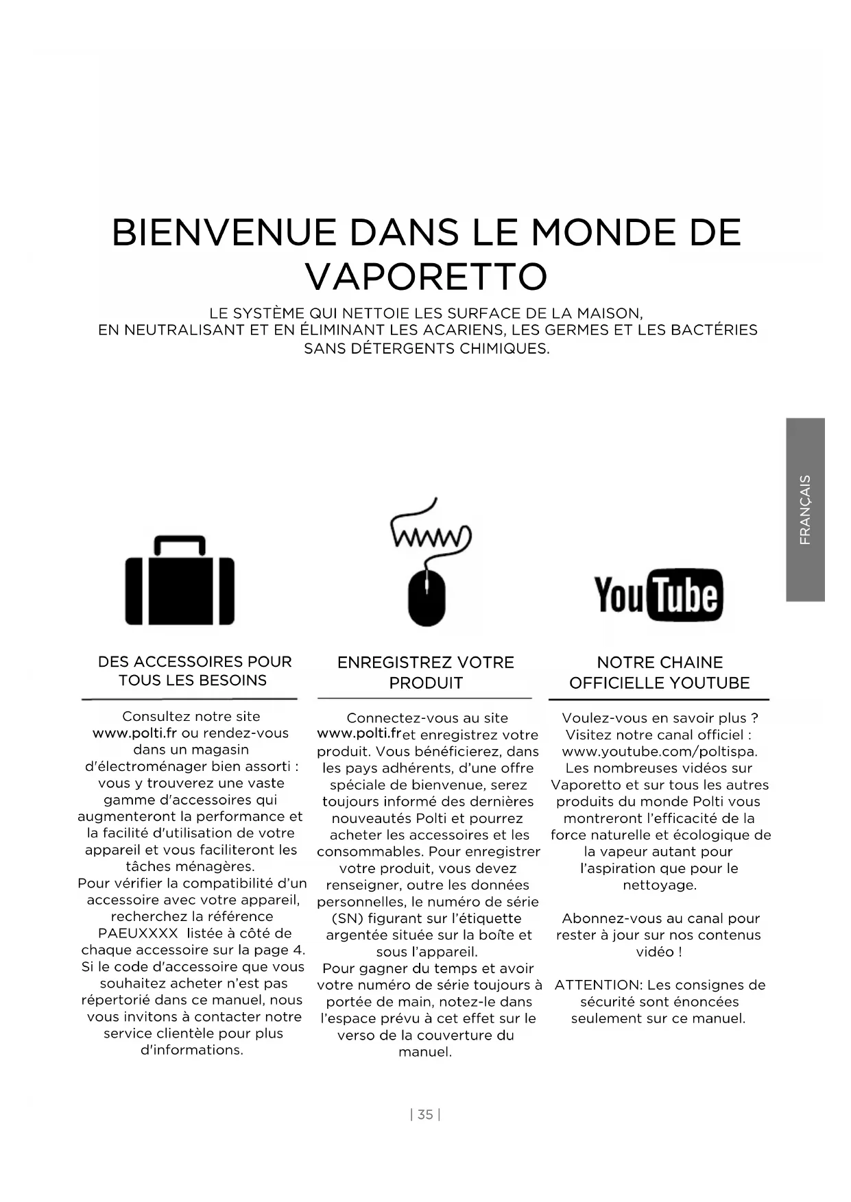 Consultez notre site www.polti.fr ou rendez-vous dans un magasin d'électroménager bien assorti : vous y trouverez une vaste gamme d'accessoires qui augmenteront la performance et la facilité d'utilisation de votre appareil et vous faciliteront les tâches ménagères. Pour vérifier la compatibilité d’un accessoire avec votre appareil, recherchez la référence PAEUXXXX listée à côté de chaque accessoire sur la page 4. Si le code d'accessoire que vous souhaitez acheter n’est pas répertorié dans ce manuel, nous vous invitons à contacter notre service clientèle pour plus d'informations. ENREGISTREZ VOTRE PRODUIT Connectez-vous au site www.polti.fr et enregistrez votre produit. Vous bénéficierez, dans les pays adhérents, d’une offre spéciale de bienvenue, serez toujours informé des dernières nouveautés Polti et pourrez acheter les accessoires et les consommables. Pour enregistrer votre produit, vous devez renseigner, outre les données personnelles, le numéro de série (SN) figurant sur l’étiquette argentée située sur la boîte et sous l’appareil. Pour gagner du temps et avoir votre numéro de série toujours à portée de main, notez-le dans l’espace prévu à cet effet sur le verso de la couverture du manuel. NOTRE CHAINE OFFICIELLE YOUTUBE Voulez-vous en savoir plus? Visitez notre canal officiel: www.youtube.com/poltispa. Les nombreuses vidéos sur Vaporetto et sur tous les autres produits du monde Polti vous montreront l’efficacité de la force naturelle et écologique de la vapeur autant pour l’aspiration que pour le nettoyage. Abonnez-vous au canal pour rester à jour sur nos contenus vidéo! ATTENTION: Les consignes de sécurité sont énoncées seulement sur ce manuel.AVERTISSEMENTS EN MATIÈRE DE SÉCURITÉ