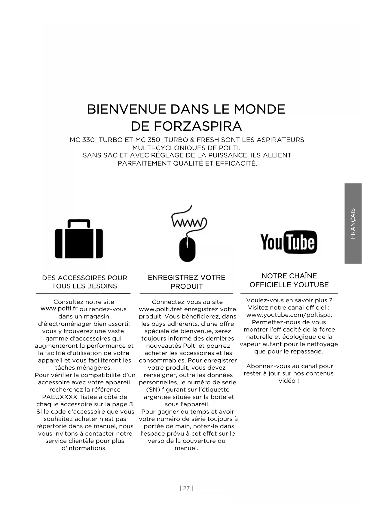 OFFICIELLE YOUTUBE Voulez-vous en savoir plus? Visitez notre canal officiel: www.youtube.com/poltispa. Permettez-nous de vous montrer l’efficacité de la force naturelle et écologique de la vapeur autant pour le nettoyage que pour le repassage. Abonnez-vous au canal pour rester à jour sur nos contenus vidéo! ENREGISTREZ VOTRE PRODUIT Connectez-vous au site www.polti.fr et enregistrez votre produit. Vous bénéficierez, dans les pays adhérents, d’une offre spéciale de bienvenue, serez toujours informé des dernières nouveautés Polti et pourrez acheter les accessoires et les consommables. Pour enregistrer votre produit, vous devez renseigner, outre les données personnelles, le numéro de série (SN) figurant sur l’étiquette argentée située sur la boîte et sous l’appareil. Pour gagner du temps et avoir votre numéro de série toujours à portée de main, notez-le dans l’espace prévu à cet effet sur le verso de la couverture du manuel.FRANÇAIS | 28 |