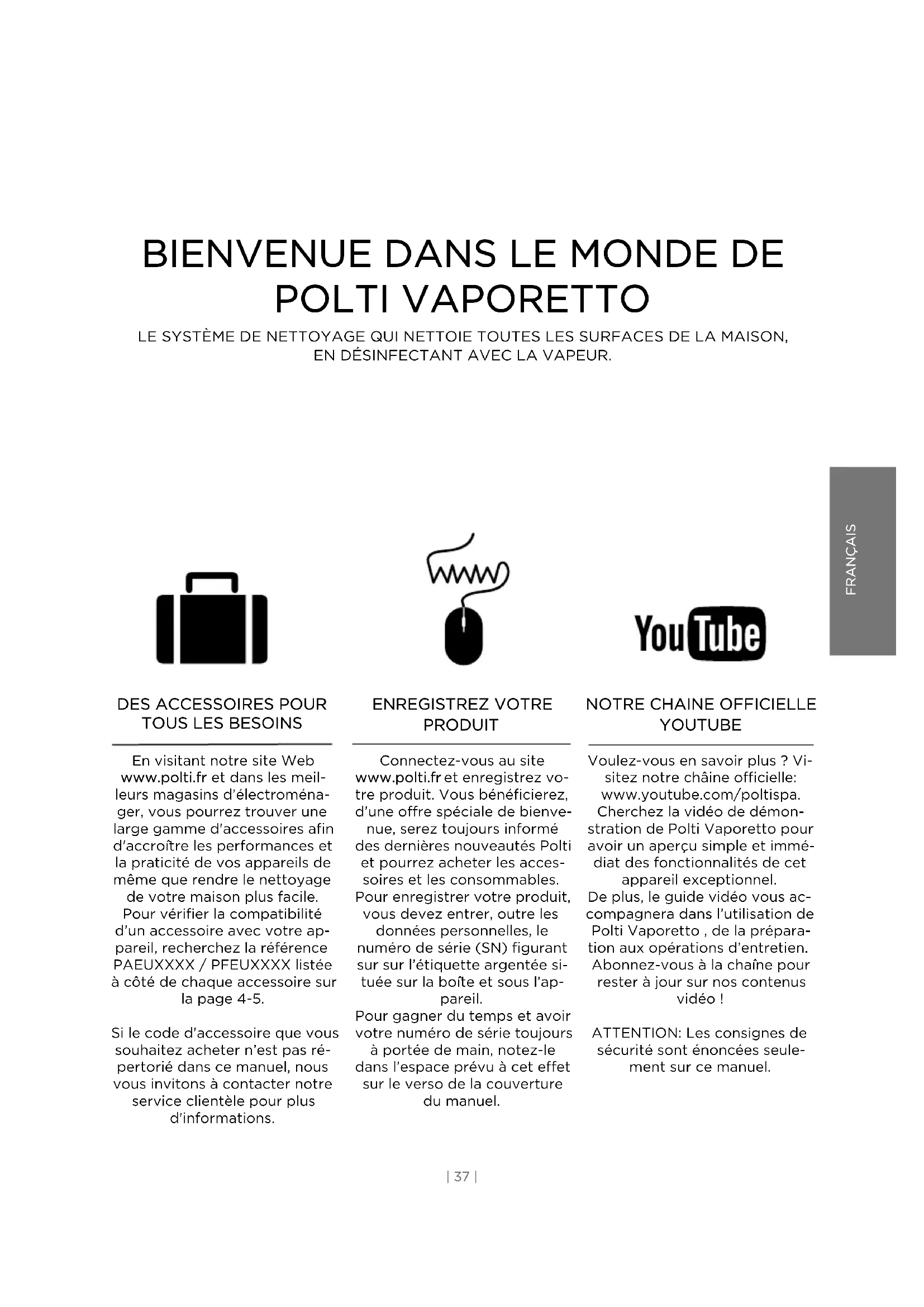 YOUTUBE Voulez-vous en savoir plus? Vi- sitez notre châine officielle: www.youtube.com/poltispa. Cherchez la vidéo de démon- stration de Polti Vaporetto pour avoir un aperçu simple et immé- diat des fonctionnalités de cet appareil exceptionnel. De plus, le guide vidéo vous ac- compagnera dans l’utilisation de Polti Vaporetto , de la prépara- tion aux opérations d’entretien. Abonnez-vous à la chaîne pour rester à jour sur nos contenus vidéo! ATTENTION: Les consignes de sécurité sont énoncées seule- ment sur ce manuel.| 38 | FRANÇAIS AVERTISSEMENTS EN MATIÈRE DE SÉCURITÉ