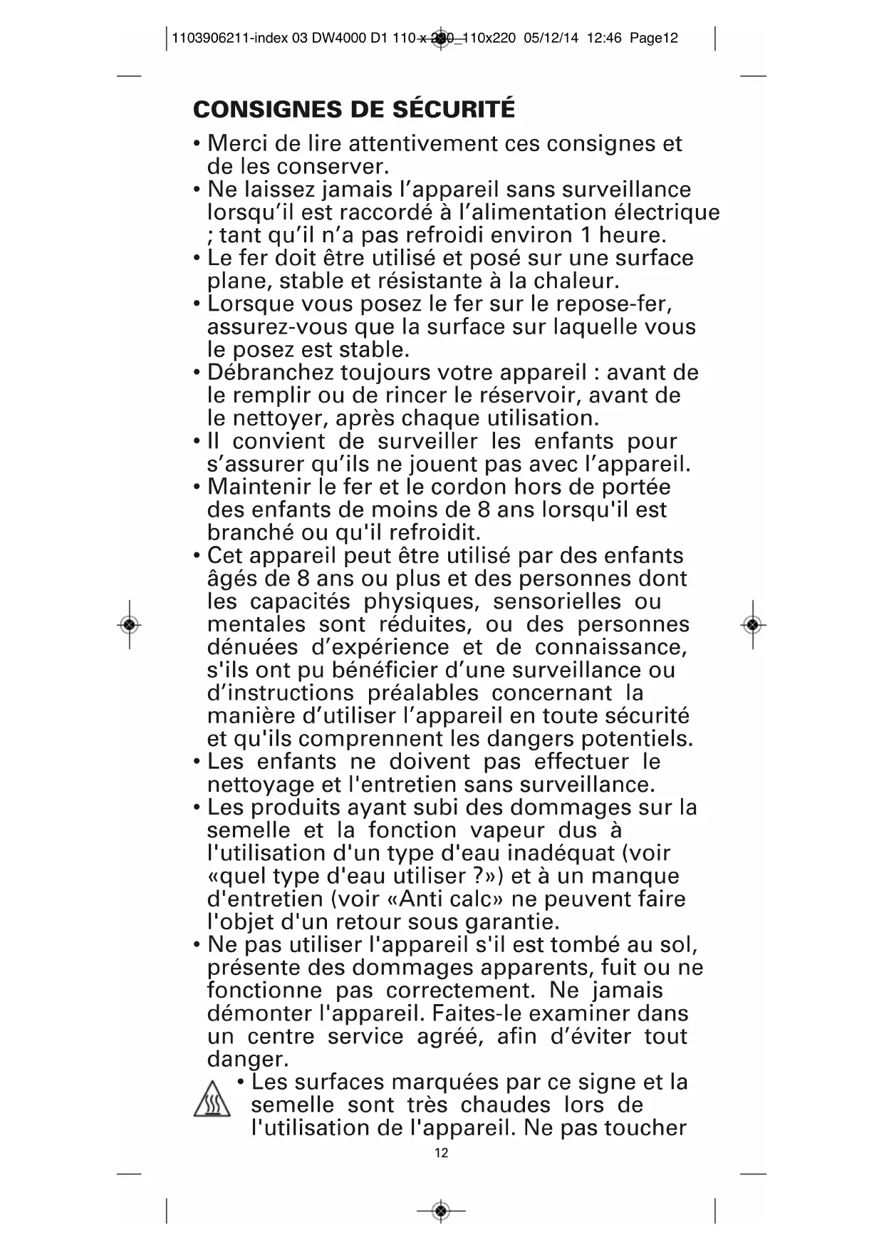 - Les surfaces marquées par ce signe et la semelle sont très chaudes lors de l'utilisation de l'appareil. Ne pas toucher 1103906211-index 03 DW4000 D1 110 x 220_110x220 05/12/14 12:46 Page12ces surfaces tant que le fer n'a pas refroidi. RECOMMANDATIONS IMPORTANTES
