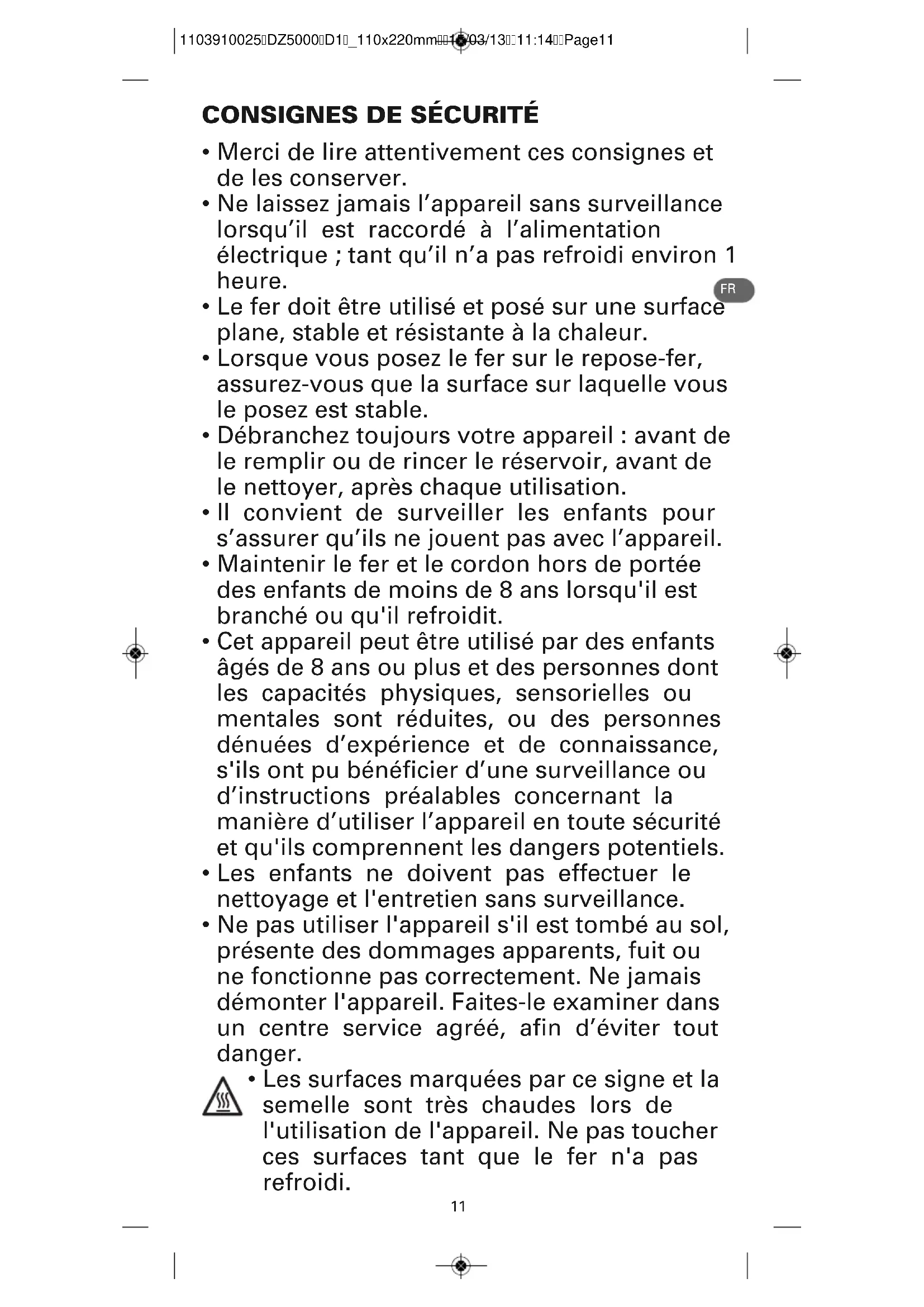 - Les surfaces marquées par ce signe et la semelle sont très chaudes lors de l'utilisation de l'appareil. Ne pas toucher ces surfaces tant que le fer n'a pas refroidi. 1103910025DZ5000D1_110x220mm15/03/1311:14Page1112 DESCRIPTION