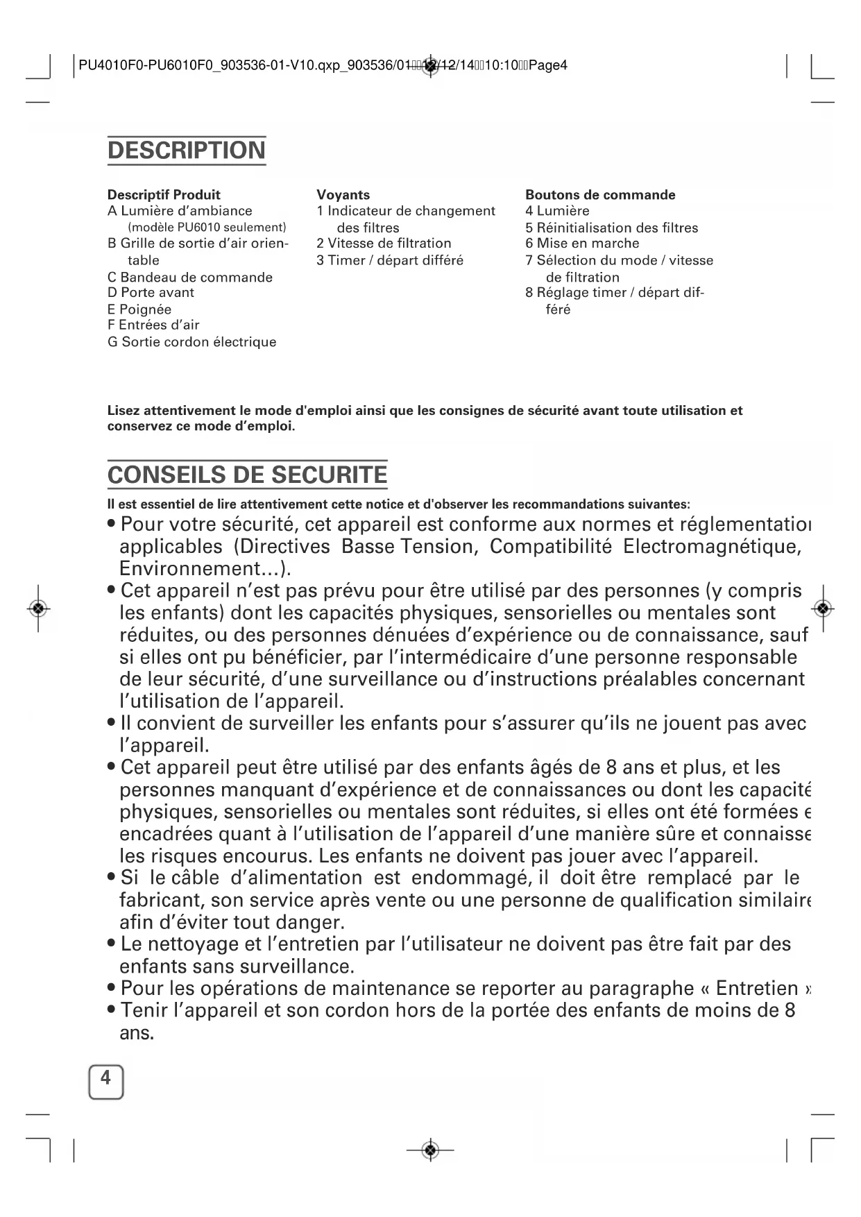 - Tenir l’appareil et son cordon hors de la portée des enfants de moins de 8 ans. Descriptif Produit A Lumière d’ambiance (modèle PU6010 seulement) B Grille de sortie d’air orien- table C Bandeau de commande D Porte avant E Poignée F Entrées d’air G Sortie cordon électrique Voyants 1 Indicateur de changement des filtres 2 Vitesse de filtration 3 Timer / départ différé Boutons de commande 4 Lumière 5 Réinitialisation des filtres 6 Mise en marche 7 Sélection du mode / vitesse de filtration 8 Réglage timer / départ dif- féré PU4010F0-PU6010F0_903536-01-V10.qxp_903536/0112/12/1410:10Page45