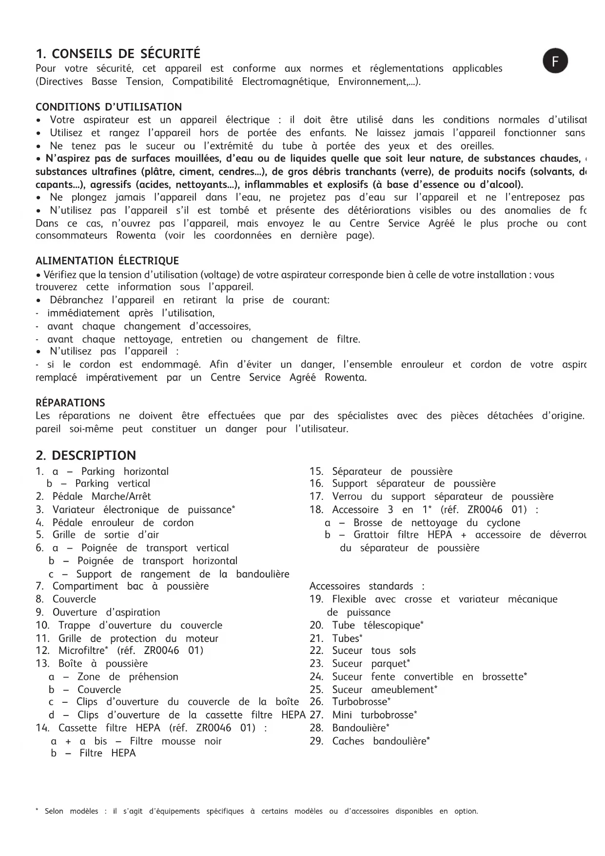 - En cas de difficultés pour obtenir les accessoires et les filtres pour cet aspirateur, contactez le service consommateurs Rowenta.