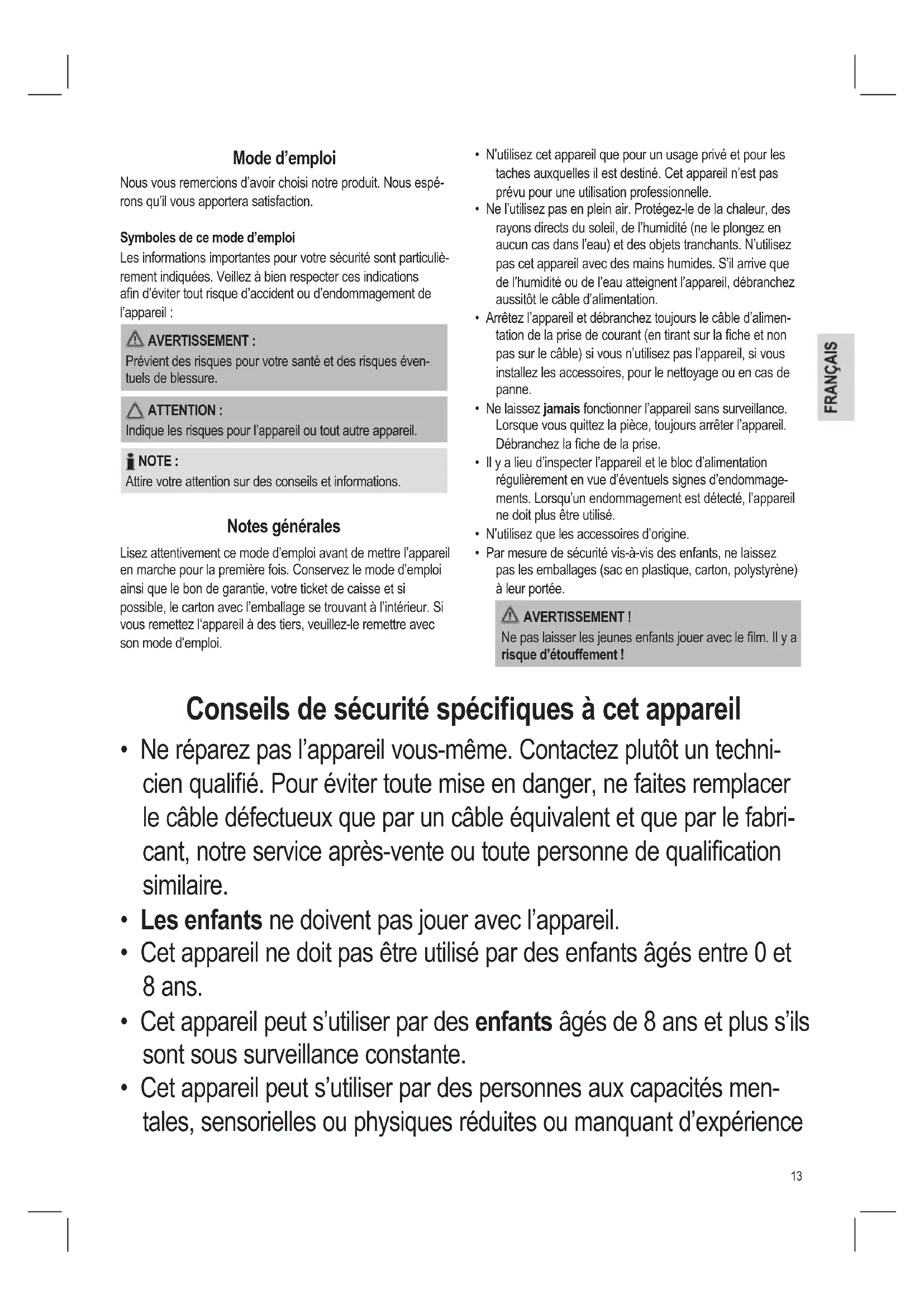 Prévient des risques pour votre santé et des risques éven- tuels de blessure. ATTENTION : Indique les risques pour l’appareil ou tout autre appareil. NOTE : Attire votre attention sur des conseils et informations. Notes générales Lisez attentivement ce mode d’emploi avant de mettre l’appareil en marche pour la première fois. Conservez le mode d’emploi ainsi que le bon de garantie, votre ticket de caisse et si possible, le carton avec l’emballage se trouvant à l’intérieur. Si vous remettez l‘appareil à des tiers, veuillez-le remettre avec son mode d‘emploi. Conseils de sécurité spéciques à cet appareil