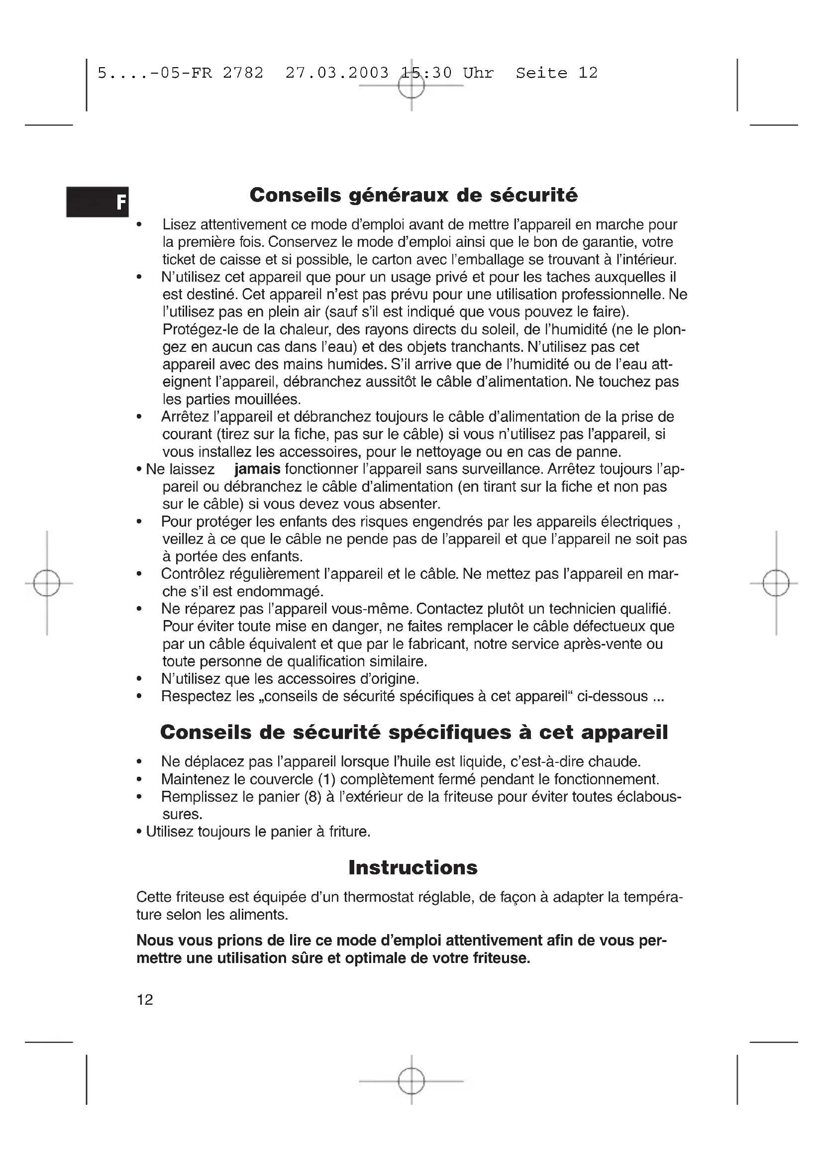 5....-05-FR 2782 27.03.2003 15:30 Uhr Seite 12Raccordement Ne branchez cet appareil que dans une prise de courant de sécurité en bon état de fonctionnement de 230 V, 50 Hz. Liste des différents éléments de commande Mise en service Avant la première utilisation