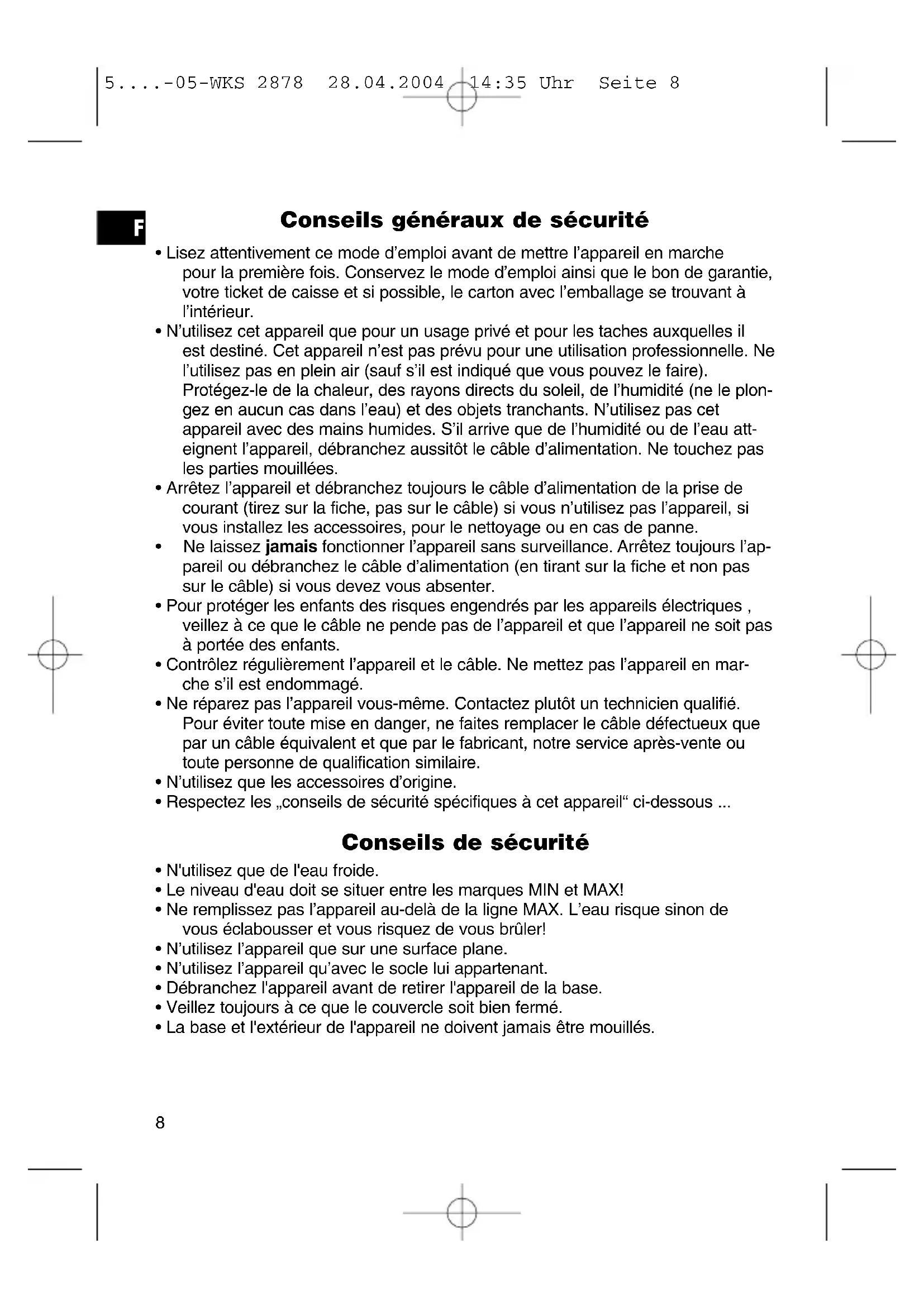 5....-05-WKS 2878 28.04.2004 14:35 Uhr Seite 8Avant la première utilisation Vous êtes prié de lire ce mode d’instruction attentivement et de le conserver dans un endroit sûr. Laissez l’appareil fonctionner 2x avec de l’eau fraîche, avant la pre- mière utilisation. N’utilisez que de l’eau pure sans additif. Utilisation