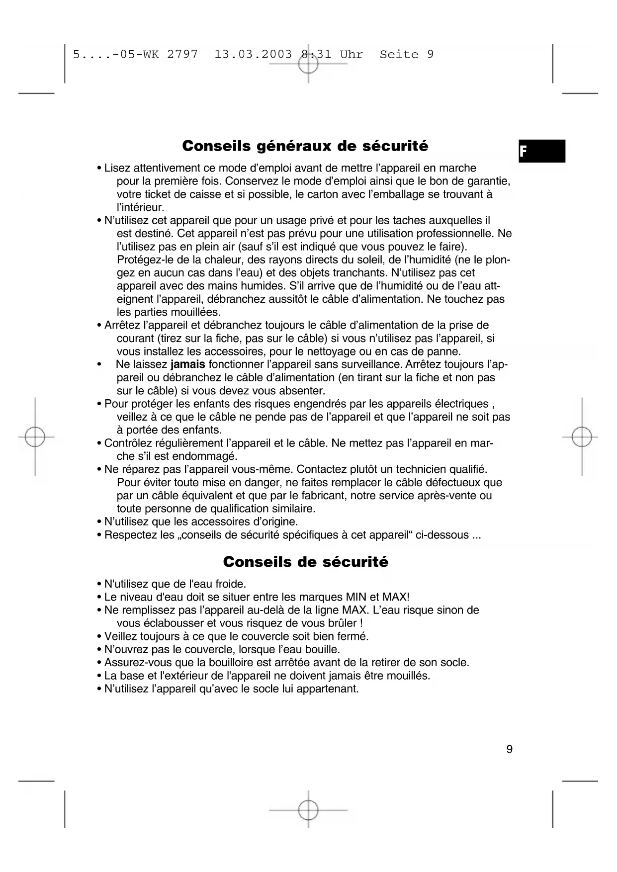 5....-05-WK 2797 13.03.2003 8:31 Uhr Seite 9Avant la première utilisation Vous êtes prié de lire ce mode d’instruction attentivement et de le conserver dans un endroit sûr. Laissez l’appareil fonctionner 2x avec de l’eau fraîche, avant la pre- mière utilisation. N’utilisez que de l’eau pure sans additif. Utilisation