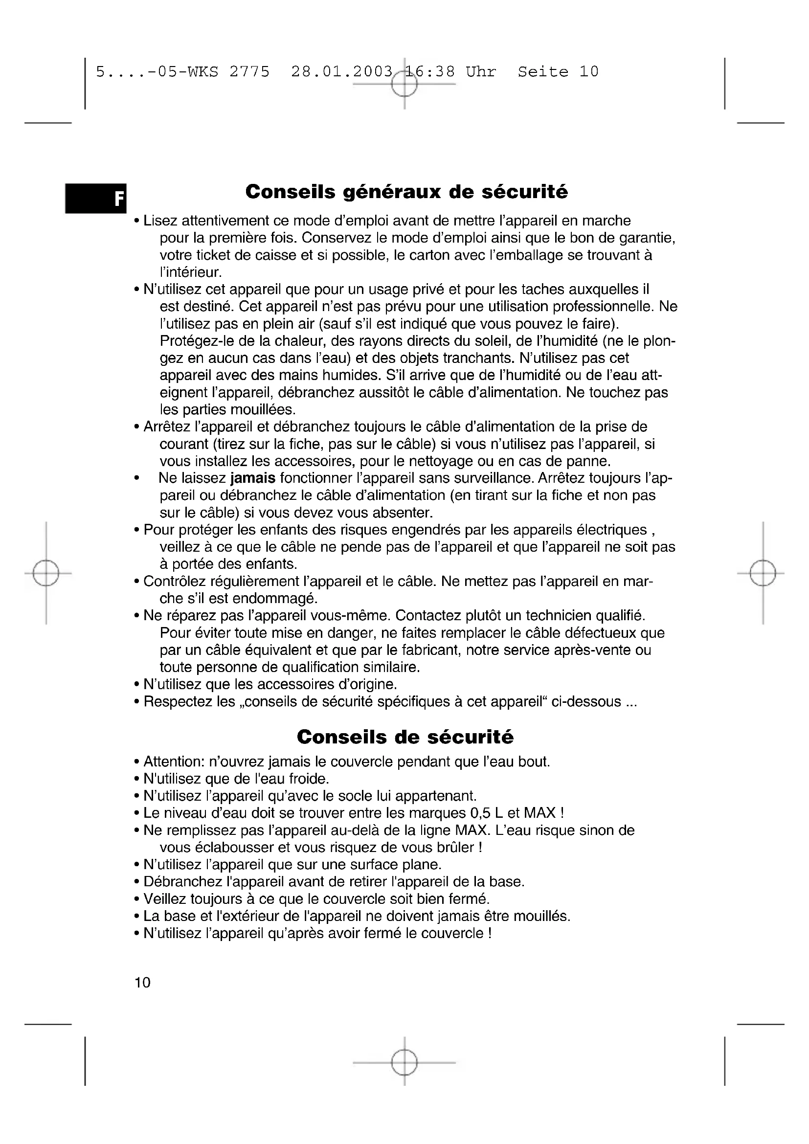 N'tutilisez que de I'eau froide. - N'utilisez l'appareil qu'avac le socle lui appartenant.