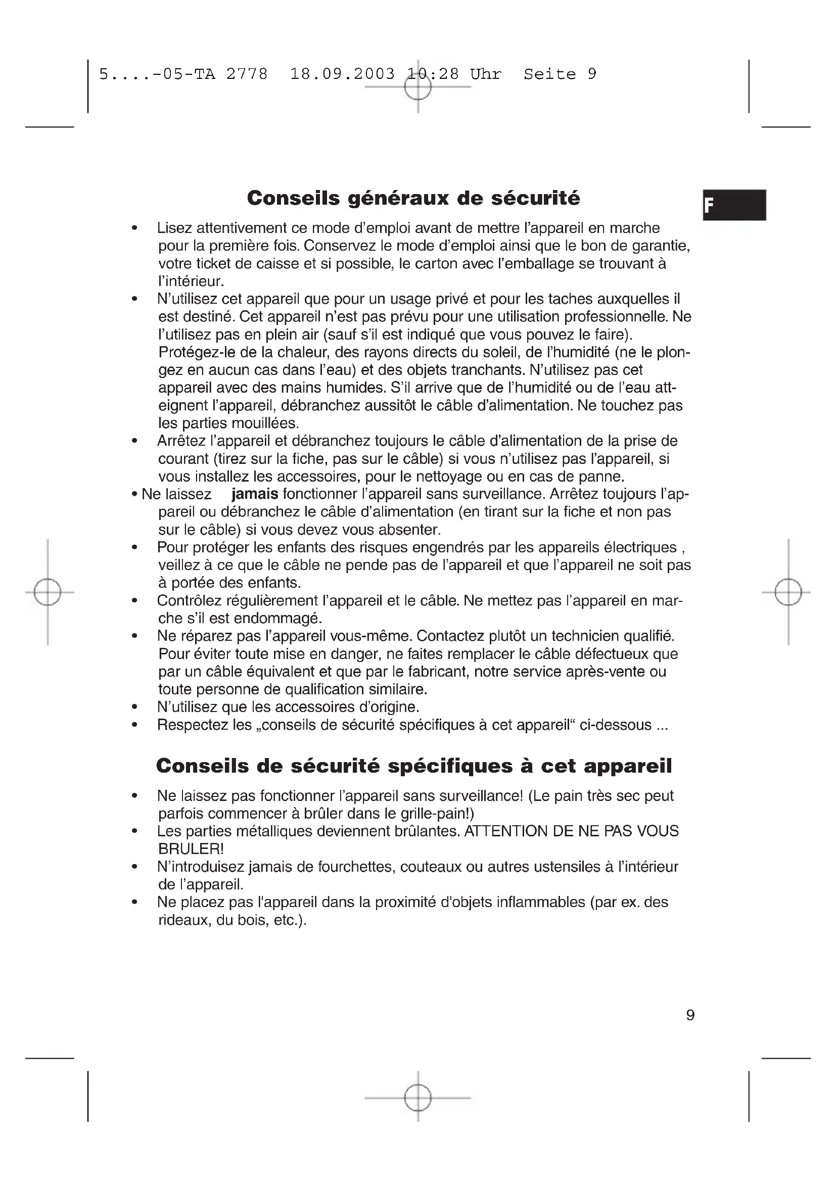 5....-05-TA 2778 18.09.2003 10:28 Uhr Seite 9Avant la première utilisation Laissez l’appareil fonctionner à vide environ 3 fois afin d’éliminer la couche de pro- tection de la résistance. Sélectionnez alors pour cela la fonction la plus forte. L’émanation légère de fumée et d’odeurs est alors normale. Veillez à une aération suffisante. Utilisation