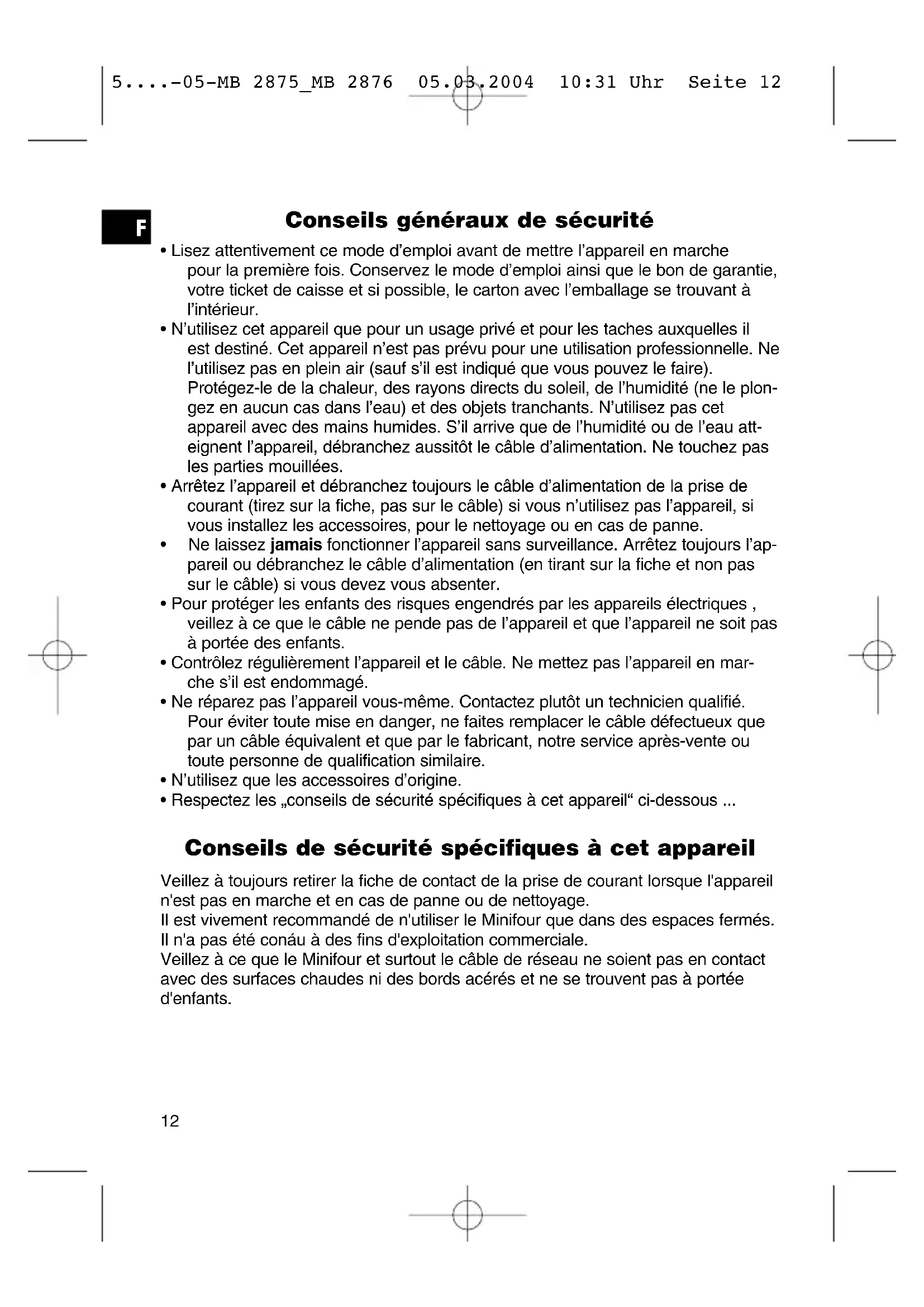 - Respectez les „conseils de sécurité spécifiques à cet appareil“ ci-dessous ... Conseils de sécurité spécifiques à cet appareil Veillez à toujours retirer la fiche de contact de la prise de courant lorsque l'appareil n'est pas en marche et en cas de panne ou de nettoyage. Il est vivement recommandé de n'utiliser le Minifour que dans des espaces fermés. Il n'a pas été conáu à des fins d'exploitation commerciale. Veillez à ce que le Minifour et surtout le câble de réseau ne soient pas en contact avec des surfaces chaudes ni des bords acérés et ne se trouvent pas à portée d'enfants.