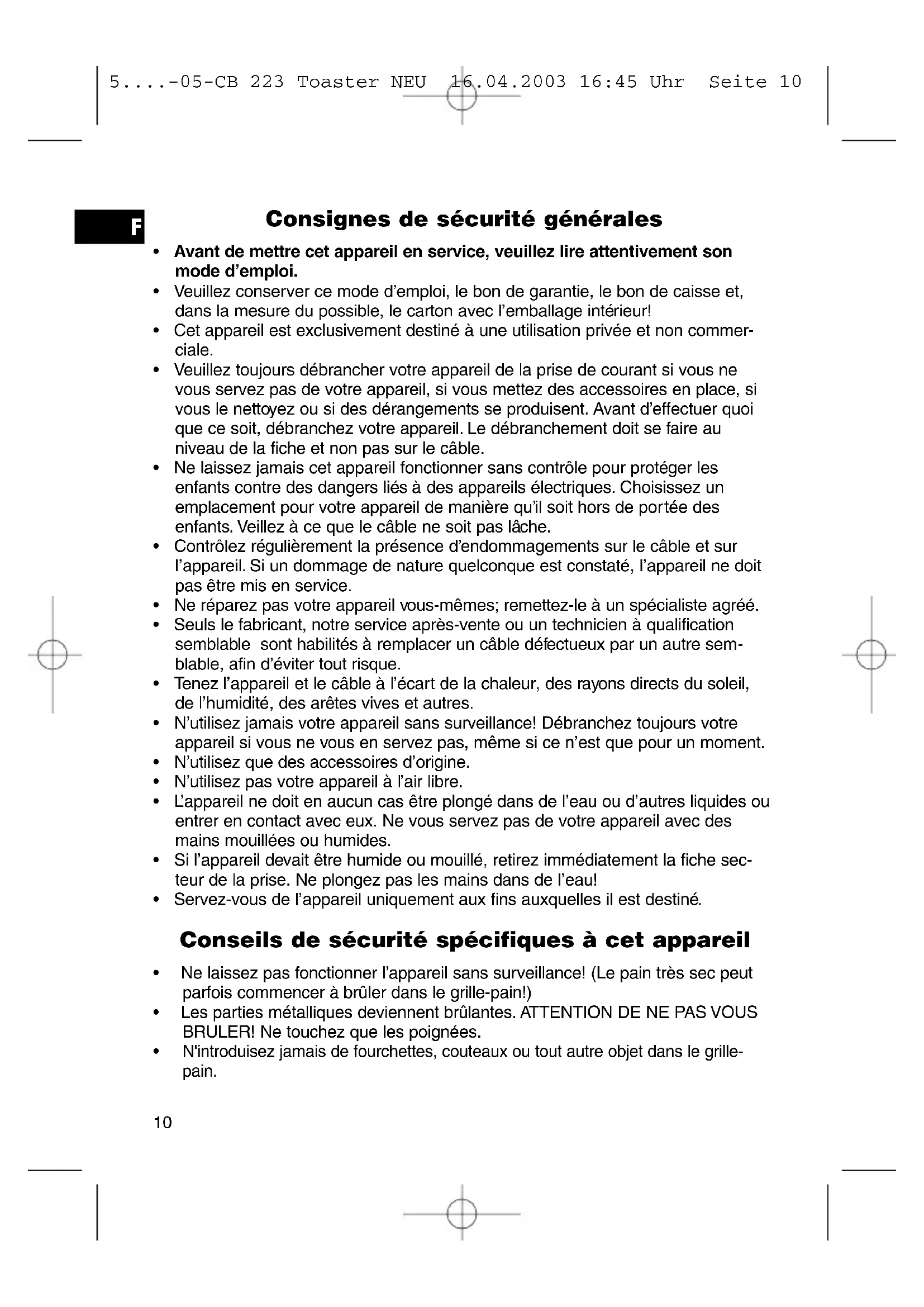 5....-05-CB 223 Toaster NEU 16.04.2003 16:45 Uhr Seite 10• Ne placez pas l'appareil dans la proximité d'objets inflammables (par ex. des rideaux, du bois, etc.).