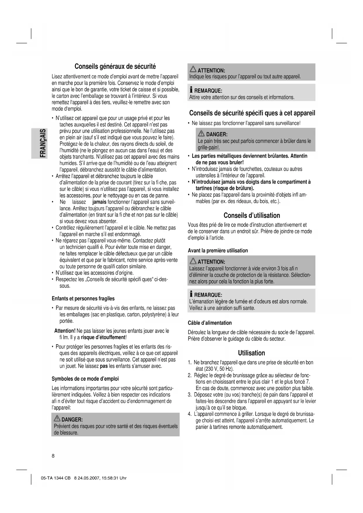 - Tirez sur la poignée du tiroir à miettes pour l’ouvrir, jetez les miettes s’y trouvant puis refermez le tiroir. Vous trouverez le bac de récupération de miettes sur le côté inférieur gauche de l’appareil (en dessous du levier pour la garniture des petits pains). Données techniques Modèle: ...................................................................... TA 1344 CB Alimentation: .............................................................230 V, 50 Hz Consommation:................................................................. 1000 W Classe de protection: ................................................................... Ι Cet appareil a été contrôlé d’après toutes les directives euro- péennes actuelles applicables, comme par exemple concernant la compatibilité électromagnétique et la basse tension. Cet ap- pareil a été fabriqué en respect des réglementations techniques de sécurité les plus récentes. Sous réserve de modifi cations techniques. Garantie Nous accordons une garantie de 24 mois à dater de la date d’achat (ticket de caisse) pour l’appareil que nous vendons. Pendant la durée de la garantie, nous éliminons gratuitement les défauts de l’appa reil ou des accessoires découlant d’un vice de matériau ou de fabrication au moyen d’une réparation ou, selon notre estimation, au moyen d’un remplacement. Les prestations dans le cadre de la garantie n’entraînent aucune prorogation de la durée de garantie et ne donnent pas droit à une nouvelle garantie ! Le justifi catif de garantie est le reçu. Sans ce justifi catif, aucun remplacement gratuit ni aucune réparation gratuite ne peuvent être effectués. En cas de recours à la garantie, ramenez votre appareil complet, dans son emballage d‘origine, accompagné de votre preuve d‘achat, à votre revendeur. Les défauts sur les accessoires ou les pièces d’usure ainsi que le nettoyage, l’entretien ou le remplacement de pièces d’usure ne sont pas garantis et sont donc payants ! En cas d’intervention étrangère, la garantie devient caduque. Après la garantie Après écoulement de la durée de garantie, les réparations peuvent être effectuées, contre paiement, par le commerce spécialisé ou le service de réparation. 05-TA 1344 CB 9 24.05.2007, 15:58:33 Uhr10 FRANÇAIS FRANÇAIS Signifi cation du symbole „Elimination“ Protégez votre environnement, ne jetez pas vos appareils électriques avec les ordures ménagères. Utilisez, pour l’élimination de vos appareils électriques, les bornes de collecte prévues à cet effet où vous pouvez vous débarrasser des appareils que vous n’utilisez plus. Vous contribuez ainsi à éviter les impacts potentiels dans l’environnement et sur la santé de chacun, causés par une mauvaise élimination de ces déchets. Vous contribuez aussi au recyclage sous toutes ses formes des appareils électriques et électroniques usagés. Vous trouverez toutes les informations sur les bornes d’élimination des appareils auprès de votre commune ou de l’administration de votre communauté. 05-TA 1344 CB 10 24.05.2007, 15:58:34 UhrFRANÇAIS