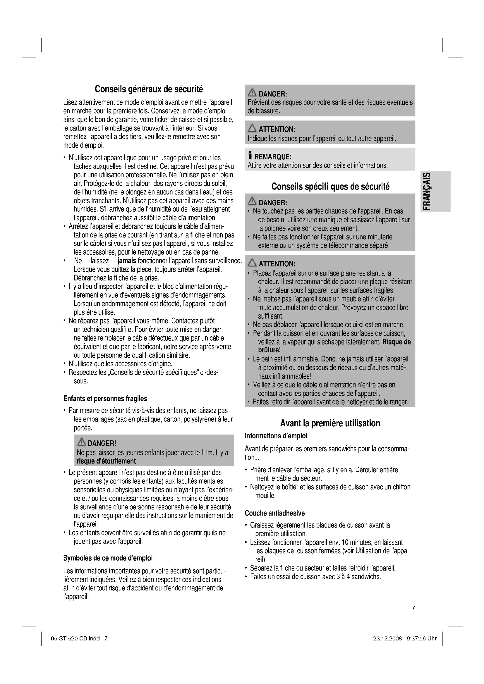 - Faites un essai de cuisson avec 3 à 4 sandwichs. 05-ST 520 CB.indd 705-ST 520 CB.indd 7 23.12.2008 9:37:56 Uhr23.12.2008 9:37:56 Uhr
