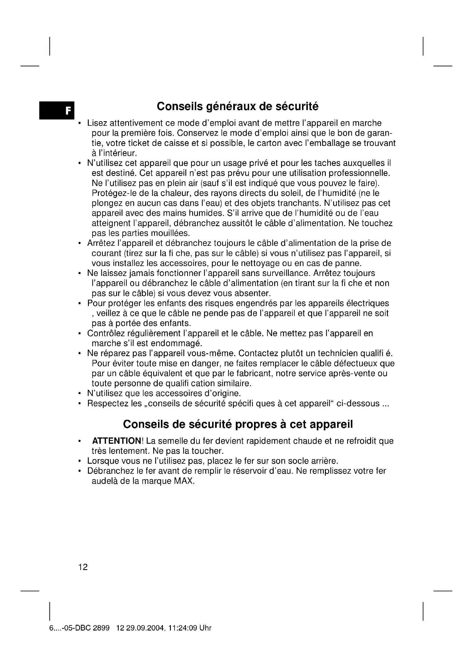- Débranchez le fer avant de remplir le réservoir d’eau. Ne remplissez votre fer audelà de la marque MAX. 6....-05-DBC 2899 12 29.09.2004, 11:24:09 UhrF