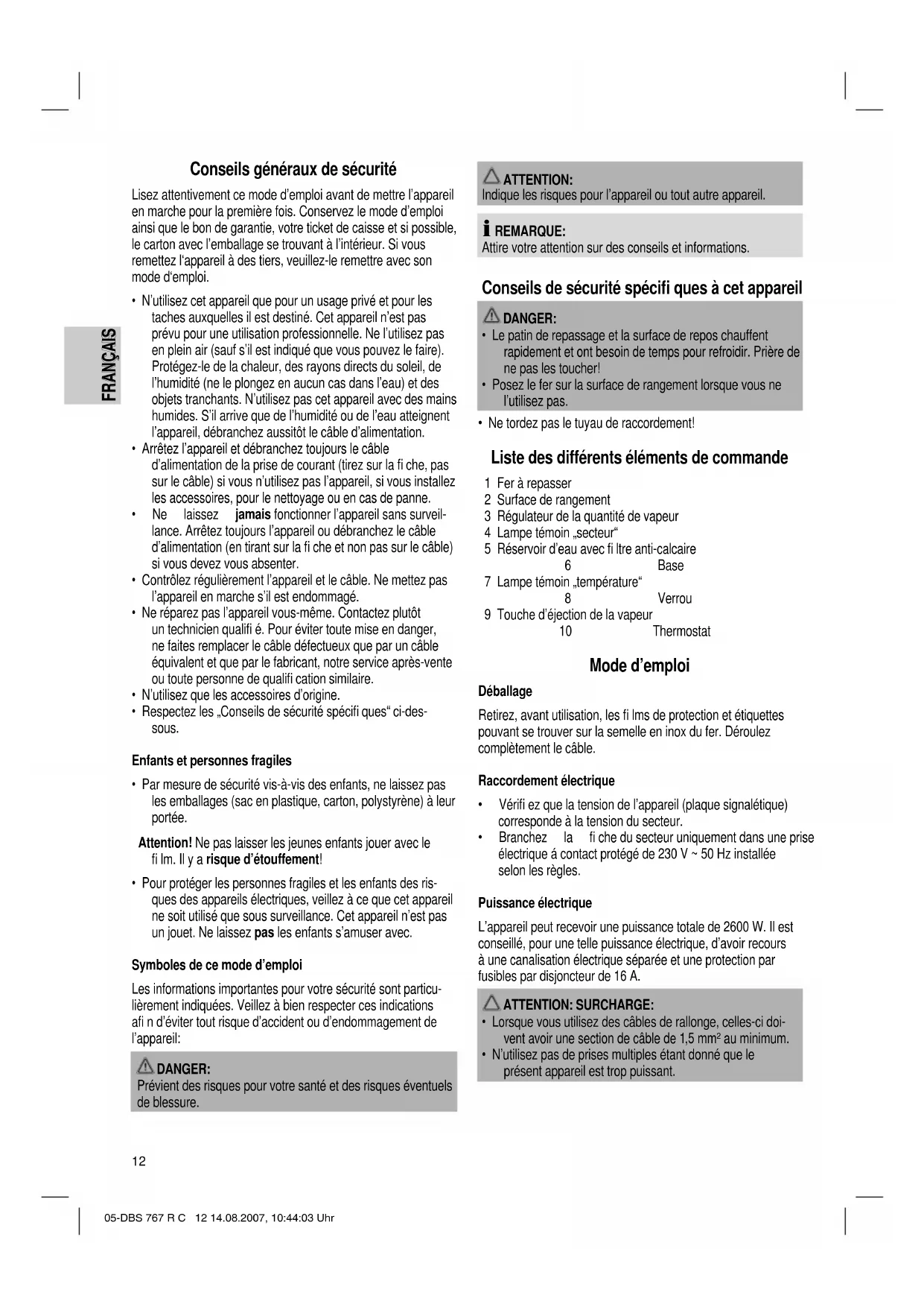 - N’utilisez pas de prises multiples étant donné que le présent appareil est trop puissant. 05-DBS 767 R C 12 14.08.2007, 10:44:03 Uhr13 FRANÇAIS FRANÇAIS Régulateur de la température sur le fer à repasser Les symboles sur le régulateur correspondent aux réglages suivants: