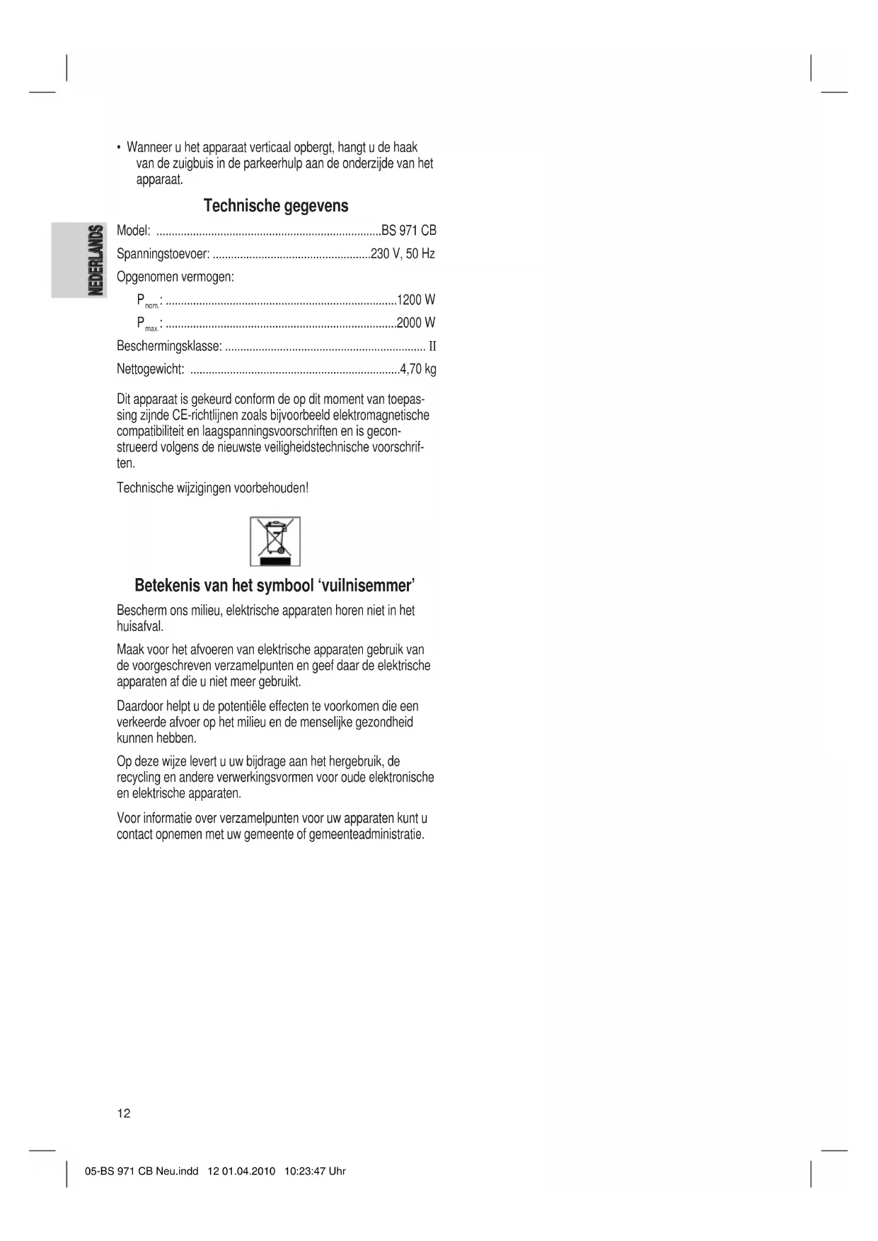 - Pour poser l’appareil à la verticale : introduisez le crochet du tuyau d’aspirateur dans la position parking située dans le bas de l’appareil. Données techniques Modèle: ........................................................................BS 971 CB Alimentation: .............................................................230 V, 50 Hz Consommation: Puissance nom. : ............................................................1200 W Puissance max. : ............................................................2000 W Classe de protection: .................................................................. ΙΙ Poids net: ..........................................................................4,70 kg Cet appareil a été contrôlé d’après toutes les directives euro- péennes actuelles applicables, comme par exemple concernant la compatibilité électromagnétique et la basse tension. Cet ap- pareil a été fabriqué en respect des réglementations techniques de sécurité les plus récentes. Sous réserve de modications techniques. Signification du symbole „Elimination“ Protégez votre environnement, ne jetez pas vos appareils électriques avec les ordures ménagères. Utilisez, pour l’élimination de vos appareils électriques, les bornes de collecte prévues à cet effet où vous pouvez vous débarrasser des appareils que vous n’utilisez plus. Vous contribuez ainsi à éviter les impacts potentiels dans l’envi- ronnement et sur la santé de chacun, causés par une mauvaise élimination de ces déchets. Vous contribuez aussi au recyclage sous toutes ses formes des appareils électriques et électroniques usagés. Vous trouverez toutes les informations sur les bornes d’élimina- tion des appareils auprès de votre commune ou de l’administra- tion de votre communauté. Indicaciones generales de seguridad Antes de la puesta en servicio de este aparato lea detenida- mente el manual de instrucciones y guarde éste bien incluido la garantía, el recibo de pago y si es posible también el cartón de embalaje con el embalaje interior. En caso de dejar el aparato a terceros, también entregue el manual de instrucciones.