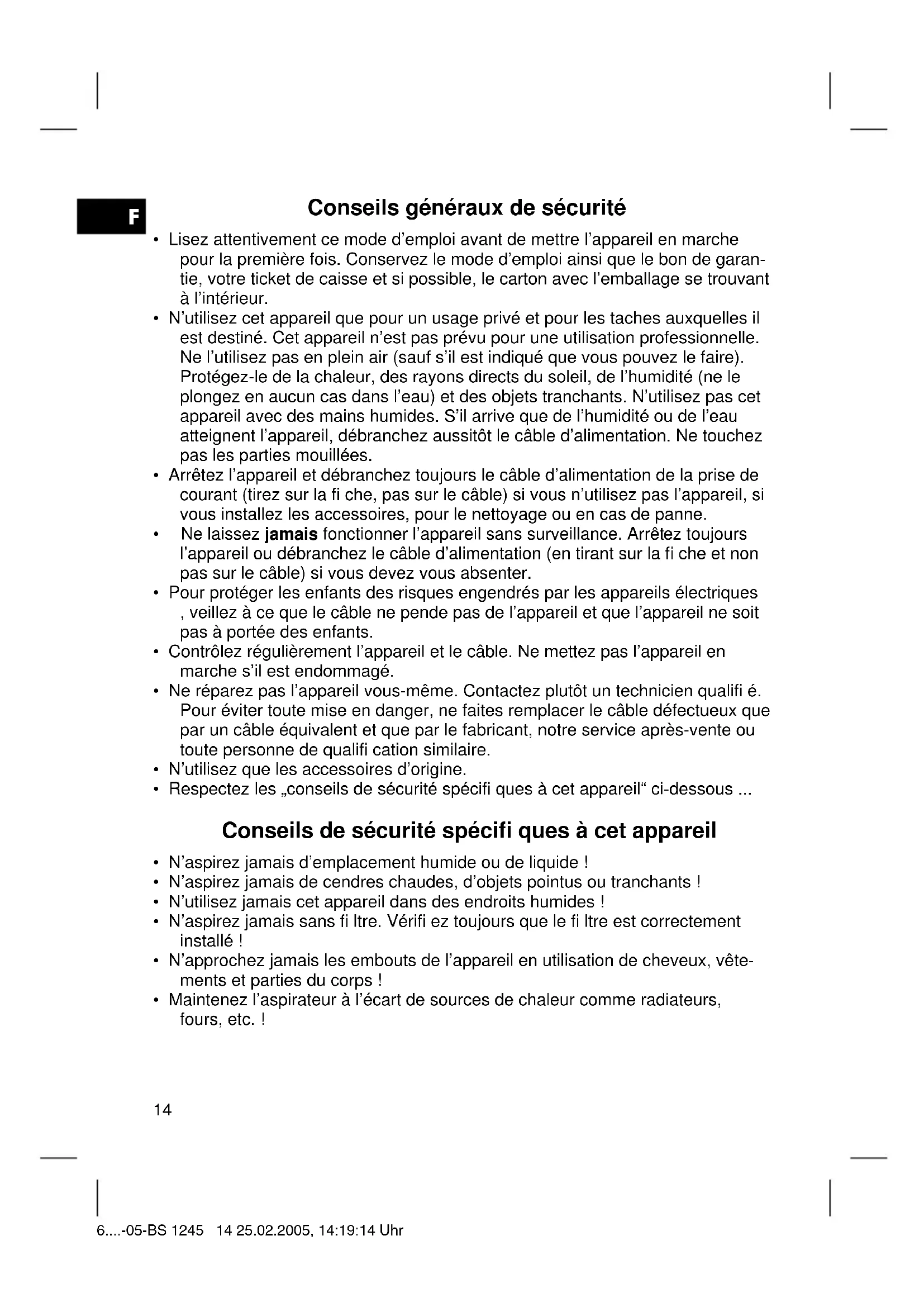 - Maintenez l’aspirateur à l’écart de sources de chaleur comme radiateurs, fours, etc. ! 6....-05-BS 1245 14 25.02.2005, 14:19:14 UhrF