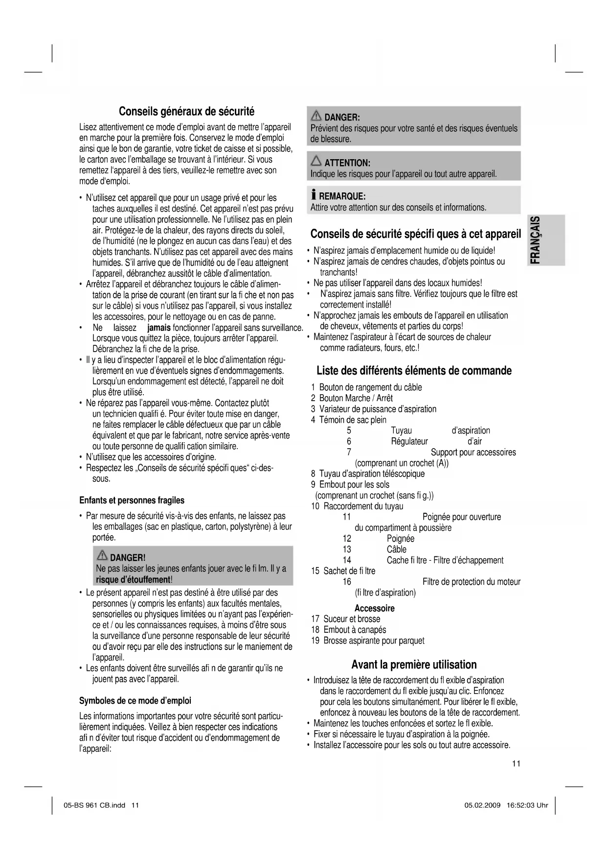 - Installez l’accessoire pour les sols ou tout autre accessoire. 05-BS 961 CB.indd 1105-BS 961 CB.indd 11 05.02.2009 16:52:03 Uhr05.02.2009 16:52:03 Uhr12 FRANÇAIS FRANÇAIS Tuyau d’aspiration télescopique Grâce au tuyau d’aspiration réglable en hauteur, il est possible d’adapter l’appareil à votre taille. Déverrouillez l’accouplement en pressant sur la touche en direction de la fl èche. Faites glisser les tuyaux d’aspiration comme vous le souhaitez. Pour verrouiller, déverrouillez la touche jusqu’à emboîtement par un bruit sec. Utilisation de l’appareil