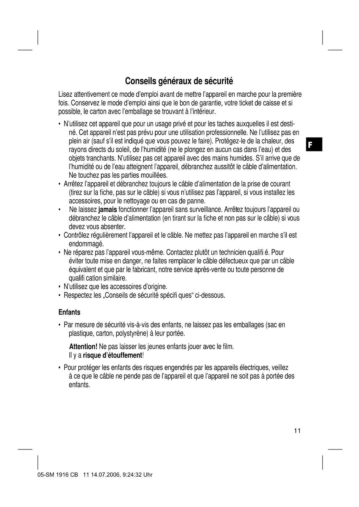 - Pour protéger les enfants des risques engendrés par les appareils électriques, veillez à ce que le câble ne pende pas de l’appareil et que l’appareil ne soit pas à portée des enfants. 05-SM 1916 CB 11 14.07.2006, 9:24:32 UhrF