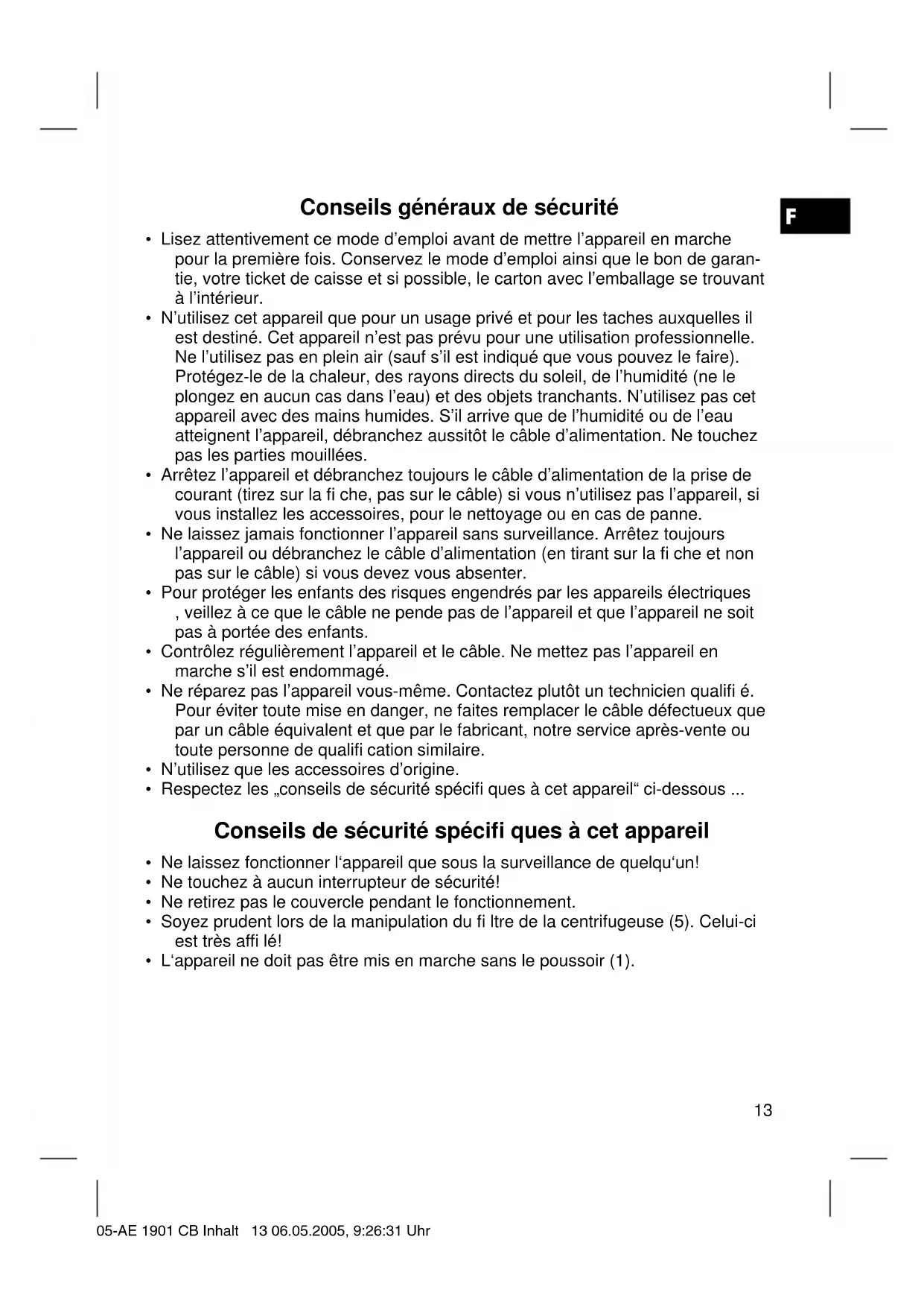 - L‘appareil ne doit pas être mis en marche sans le poussoir (1). 05-AE 1901 CB Inhalt 13 06.05.2005, 9:26:31 UhrF