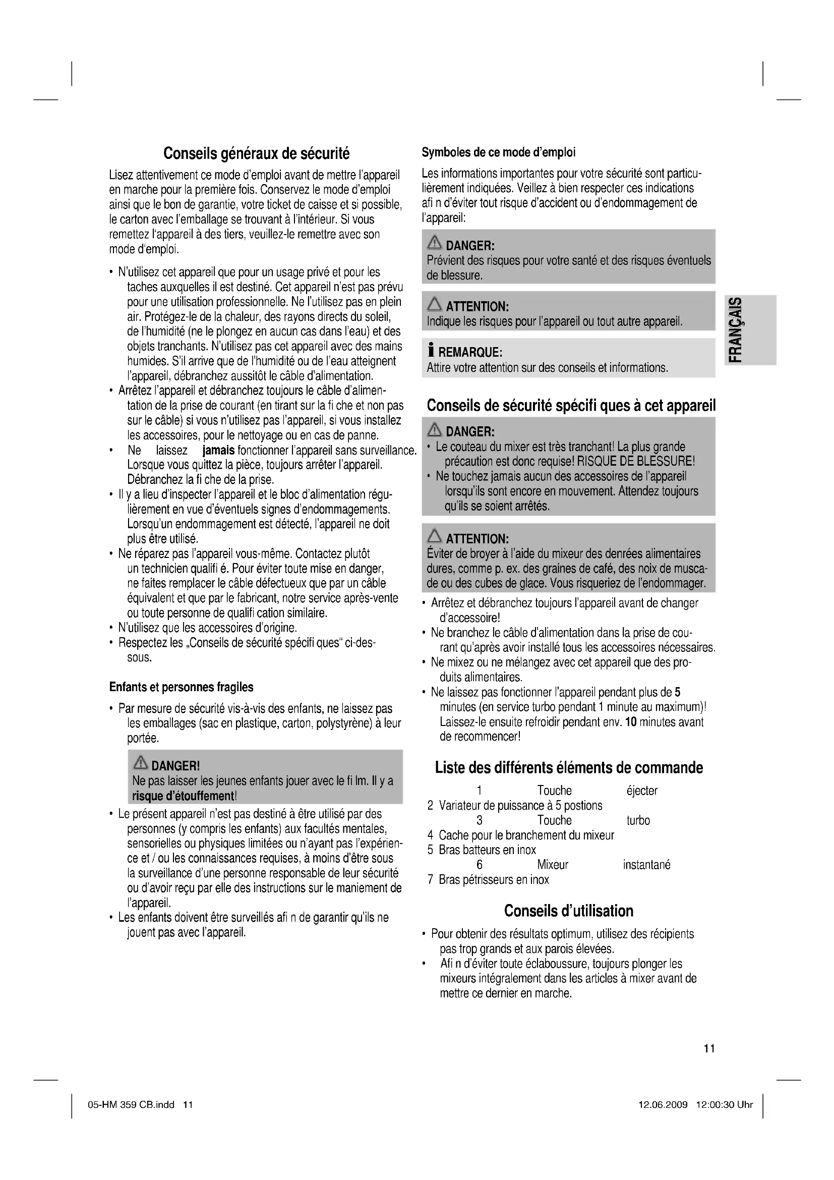 - Afi n d’éviter toute éclaboussure, toujours plonger les mixeurs intégralement dans les articles à mixer avant de mettre ce dernier en marche. 05-HM 359 CB.indd 1105-HM 359 CB.indd 11 12.06.2009 12:00:30 Uhr12.06.2009 12:00:30 Uhr12 FRANÇAIS FRANÇAIS