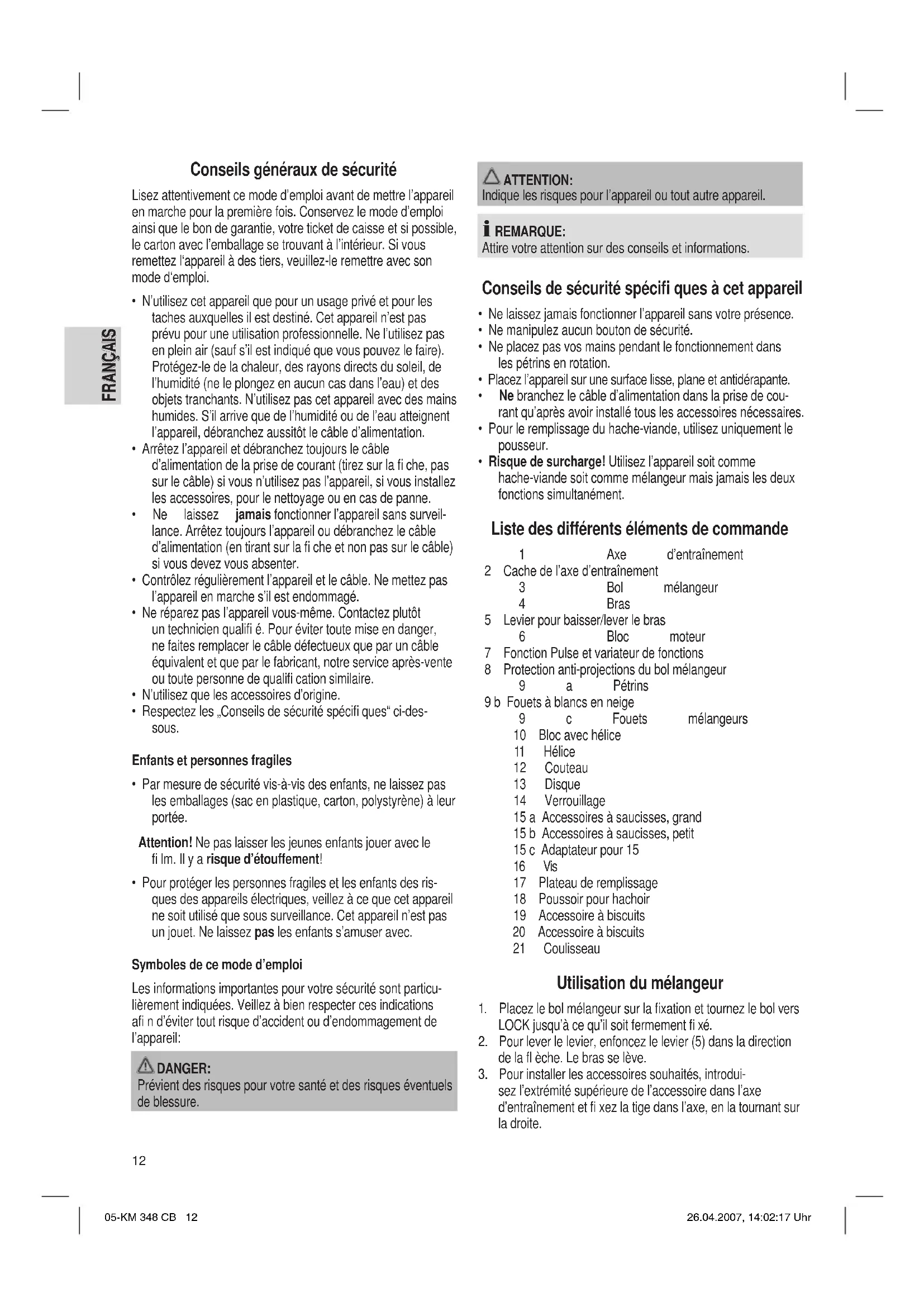 sez l’extrémité supérieure de l’accessoire dans l’axe d’entraînement et fi xez la tige dans l’axe, en la tournant sur la droite. 05-KM 348 CB 12 26.04.2007, 14:02:17 Uhr13 FRANÇAIS FRANÇAIS