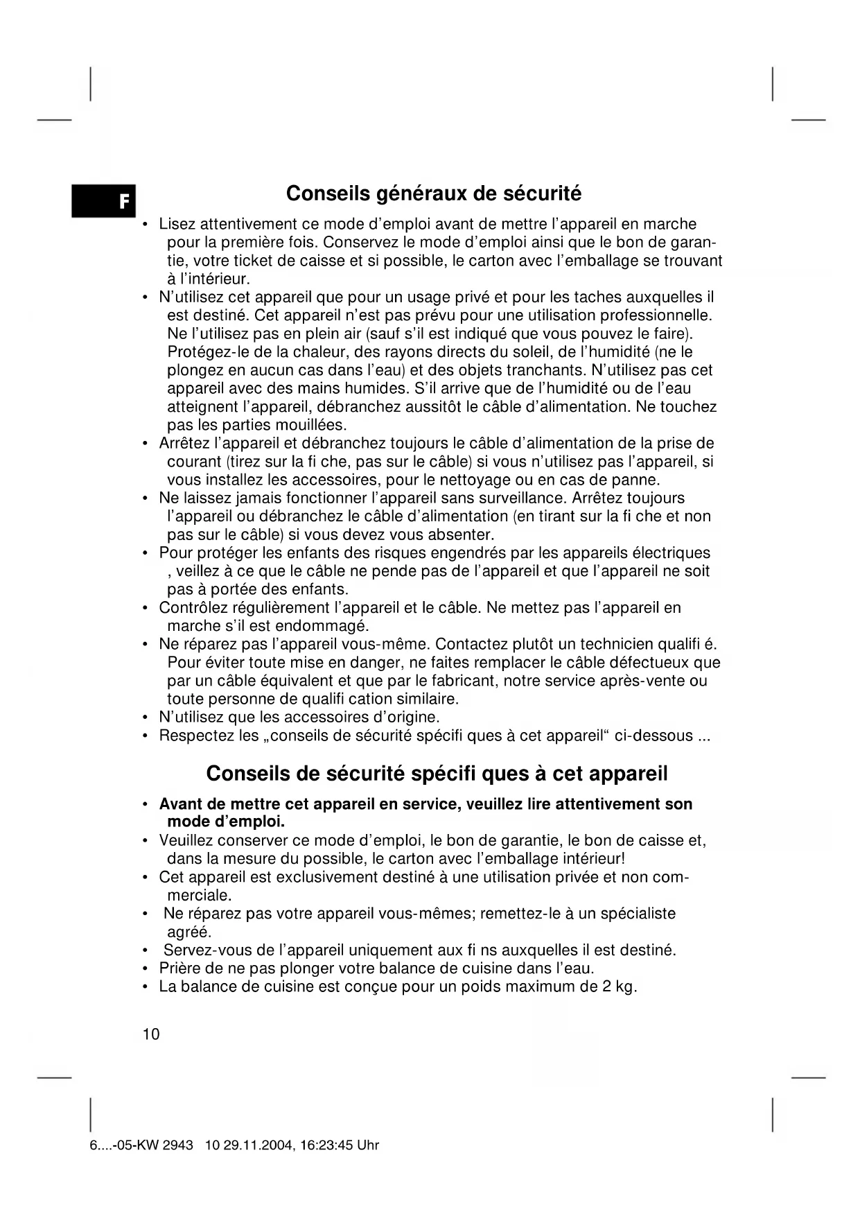 - Lorsque “EE” apparaît sur l’écran, le poids dépasse les 2 kg. Cet appareil a été contrôlé d’après toutes les directives européennes actuelles applicables, comme par exemple concernant la compatibilité électromagnétique et la basse tension. Cet appareil a été fabriqué en respect des réglementations techniques de sécurité les plus récentes. Sous réserve de modifi cations techniques. Garantie Nous accordons une garantie de 24 mois à dater de la date d’achat (ticket de caisse) pour l’appareil que nous vendons. Pendant la durée de la garantie, nous éliminons gratuitement les défauts de l’appa reil ou des accessoires *) découlant d’un vice de matériau ou de fabrication au moyen d’une réparation ou, selon notre estimation, au moyen d’un remplace- ment. Les prestations dans le cadre de la garantie n’entraînent aucune prorogati- on de la durée de garantie et ne donnent pas droit à une nouvelle garantie ! Le justifi catif de garantie est le reçu. Sans ce justifi catif, aucun remplacement gratuit ni aucune réparation gratuite ne peuvent être effectués. En cas de recours à la garantie, ramenez votre appareil complet, dans son emballage d‘origine, accompagné de votre preuve d‘achat, à votre revendeur. *) Les endommagements de pièces d’accessoires ne justifi ent pas automati- quement l’échange gratuit de l’appareil complet. Contactez alors notre centrale 6....-05-KW 2943 12 29.11.2004, 16:23:45 UhrF