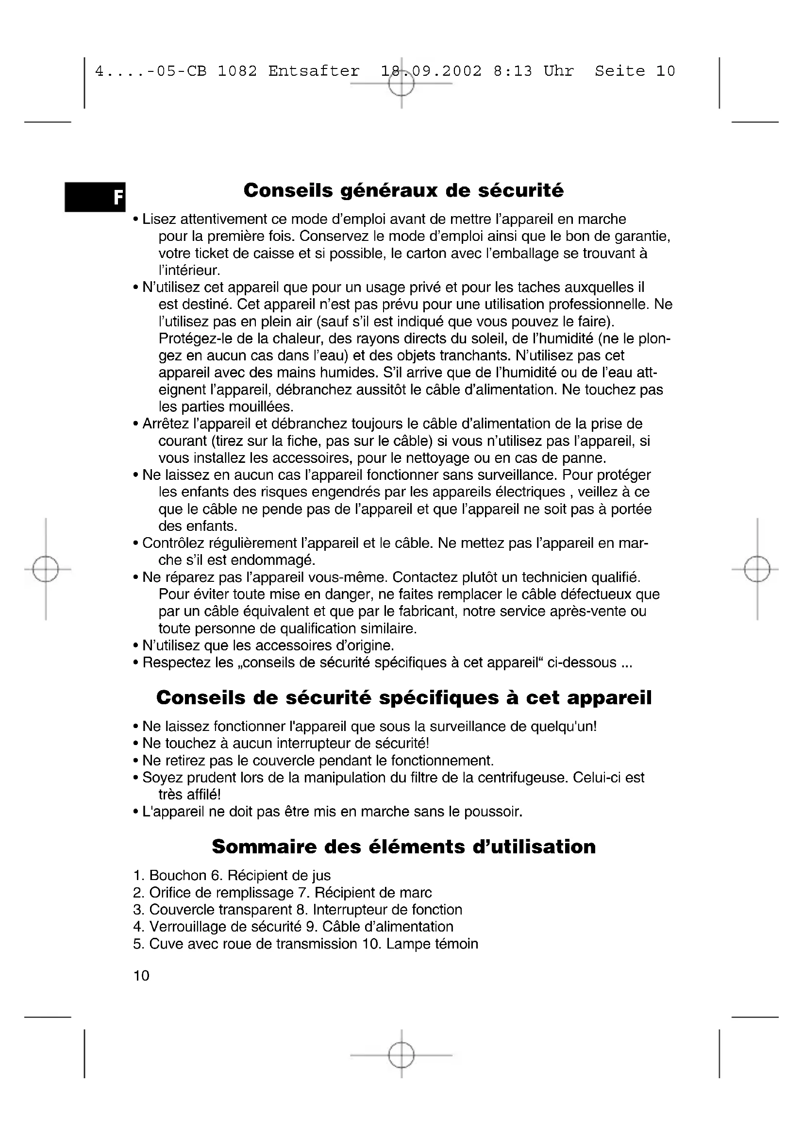 - Respectez les „conseils de sécurité spécifiques à cet appareil“ ci-dessous ... Conseils de sécurité spécifiques à cet appareil