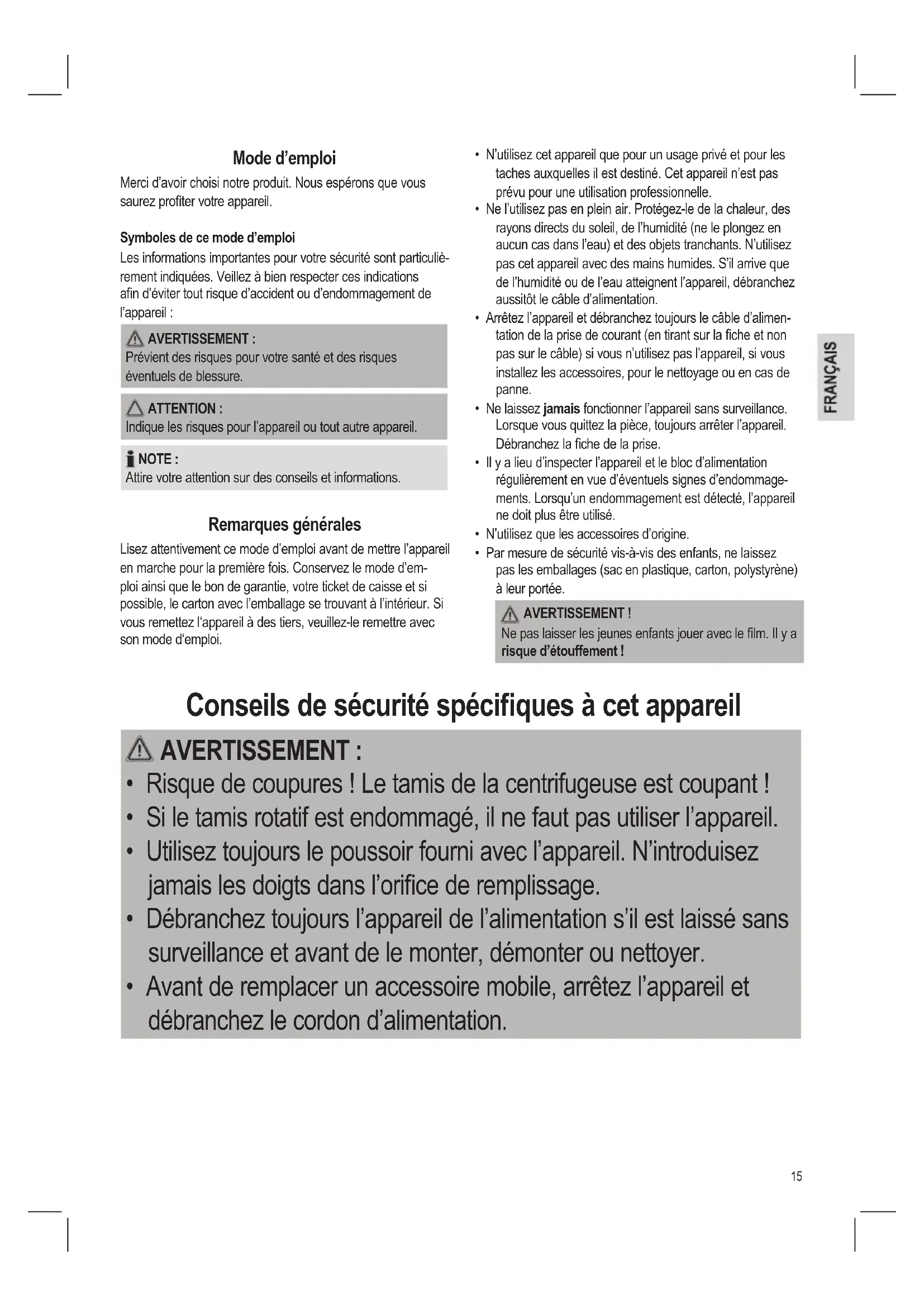 - Risque de coupures ! Le tamis de la centrifugeuse est coupant !