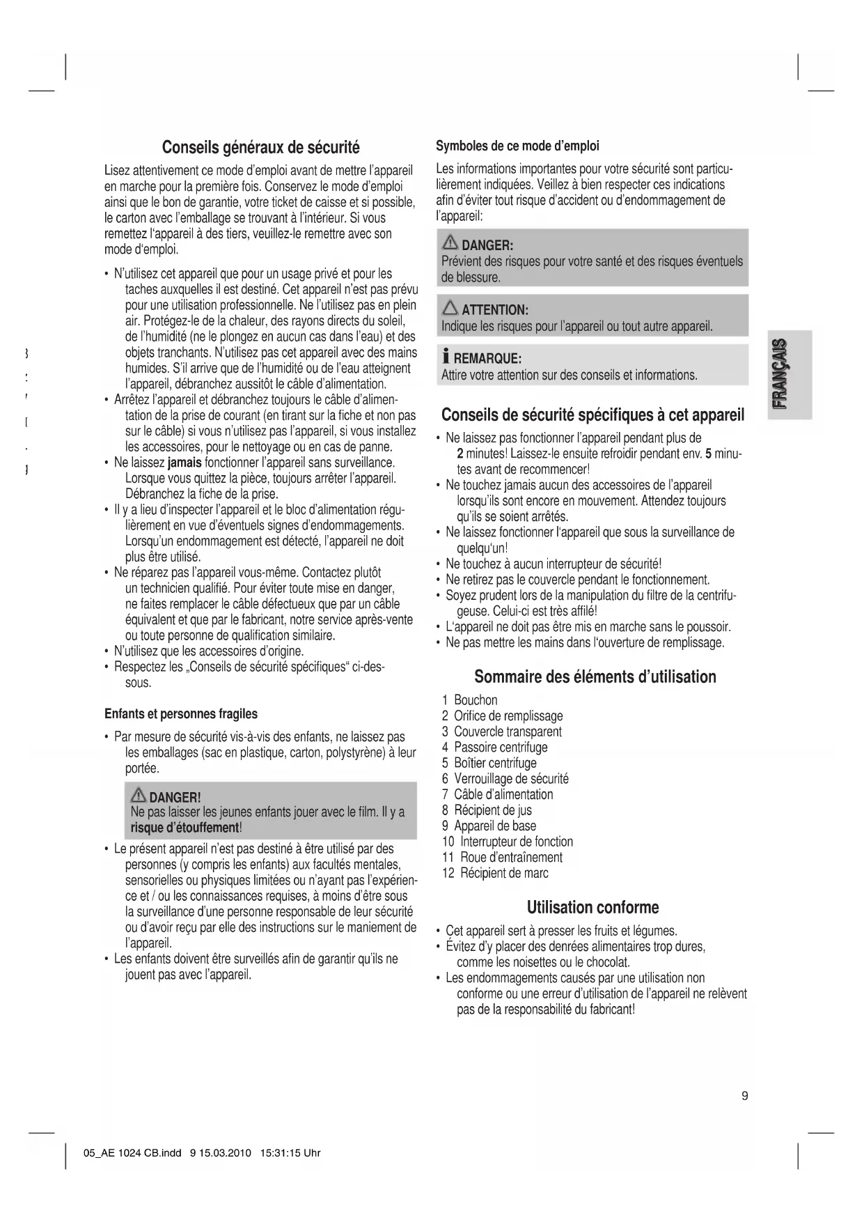 - Les enfants doivent être surveillés an de garantir qu’ils ne jouent pas avec l’appareil. 05_AE 1024 CB.indd 8 15.03.2010 15:31:15 Uhr9 FRANÇAIS Stopper, transparante afdekking, centrifugezeef, centrifugebehuizing, sapbeker/pulpreservoir