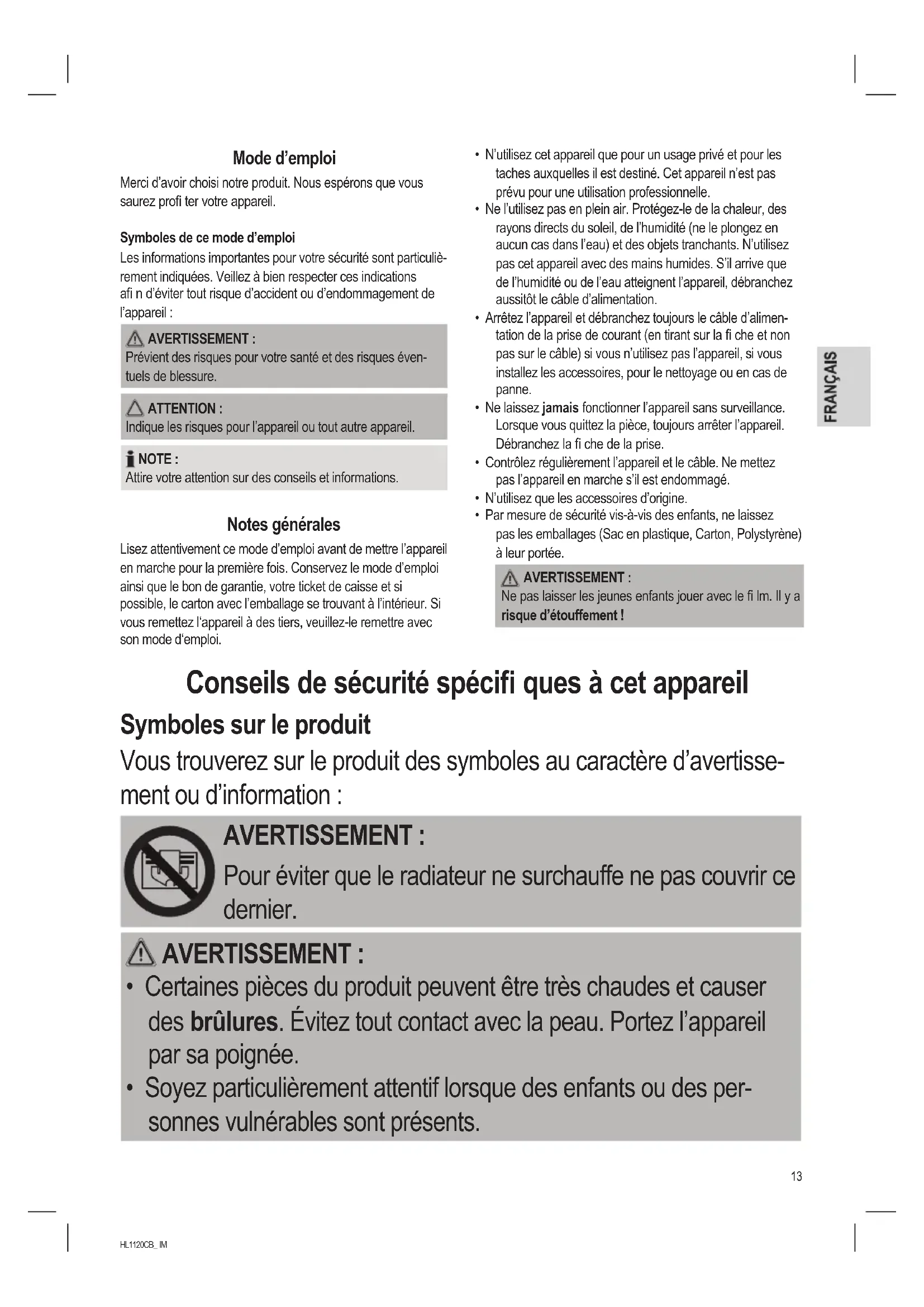 - Soyez particulièrement attentif lorsque des enfants ou des per- sonnes vulnérables sont présents.14 HL1120CB_ IM 07.04.16