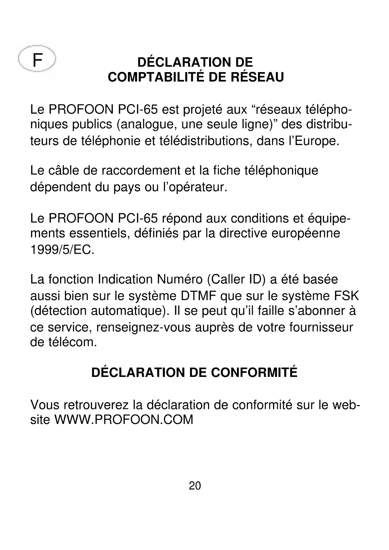 Le PROFOON PCI-65 est projeté aux “réseaux télépho- niques publics (analogue, une seule ligne)” des distribu- teurs de téléphonie et télédistributions, dans l’Europe. Le câble de raccordement et la fiche téléphonique dépendent du pays ou l’opérateur. Le PROFOON PCI-65 répond aux conditions et équipe- ments essentiels, définiés par la directive européenne 1999/5/EC. La fonction Indication Numéro (Caller ID) a été basée aussi bien sur le système DTMF que sur le système FSK (détection automatique). Il se peut qu’il faille s’abonner à ce service, renseignez-vous auprès de votre fournisseur de télécom.
