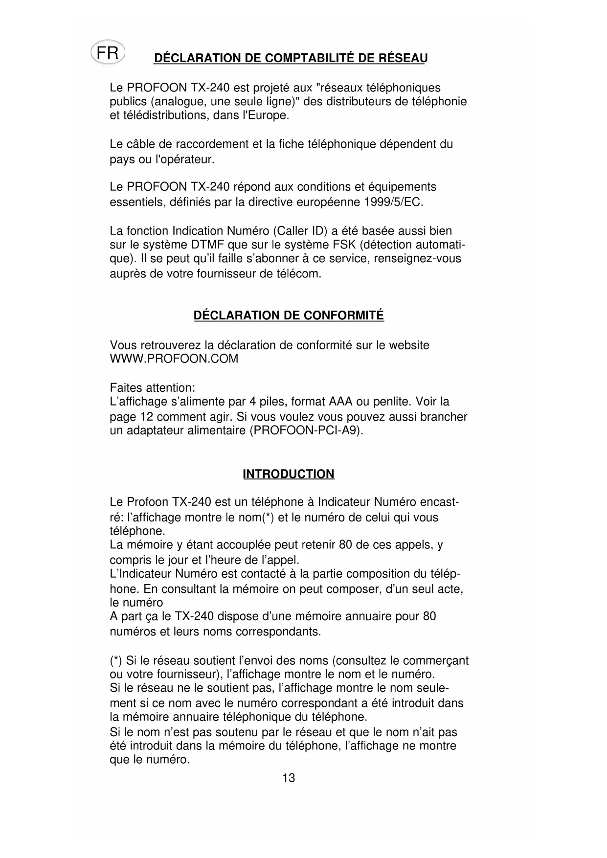 Faites attention: L’affichage s’alimente par 4 piles, format AAA ou penlite. Voir la page 12 comment agir. Si vous voulez vous pouvez aussi brancher un adaptateur alimentaire (PROFOON-PCI-A9). INTRODUCTION Le Profoon TX-240 est un téléphone à Indicateur Numéro encast- ré: l’affichage montre le nom(*) et le numéro de celui qui vous téléphone. La mémoire y étant accouplée peut retenir 80 de ces appels, y compris le jour et l’heure de l’appel. L’Indicateur Numéro est contacté à la partie composition du télép- hone. En consultant la mémoire on peut composer, d’un seul acte, le numéro A part ça le TX-240 dispose d’une mémoire annuaire pour 80 numéros et leurs noms correspondants. (*) Si le réseau soutient l’envoi des noms (consultez le commerçant ou votre fournisseur), l’affichage montre le nom et le numéro. Si le réseau ne le soutient pas, l’affichage montre le nom seule- ment si ce nom avec le numéro correspondant a été introduit dans la mémoire annuaire téléphonique du téléphone. Si le nom n’est pas soutenu par le réseau et que le nom n’ait pas été introduit dans la mémoire du téléphone, l’affichage ne montre que le numéro.