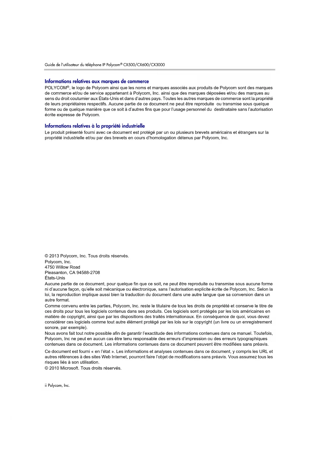 Nous avons fait tout notre possible afin de garantir l'exactitude des informations contenues dans ce manuel. Toutefois, Polycom, Inc ne peut en aucun cas être tenu responsable des erreurs d'impression ou des erreurs typographiques contenues dans ce document. Les informations contenues dans ce document peuvent être modifiées sans préavis.