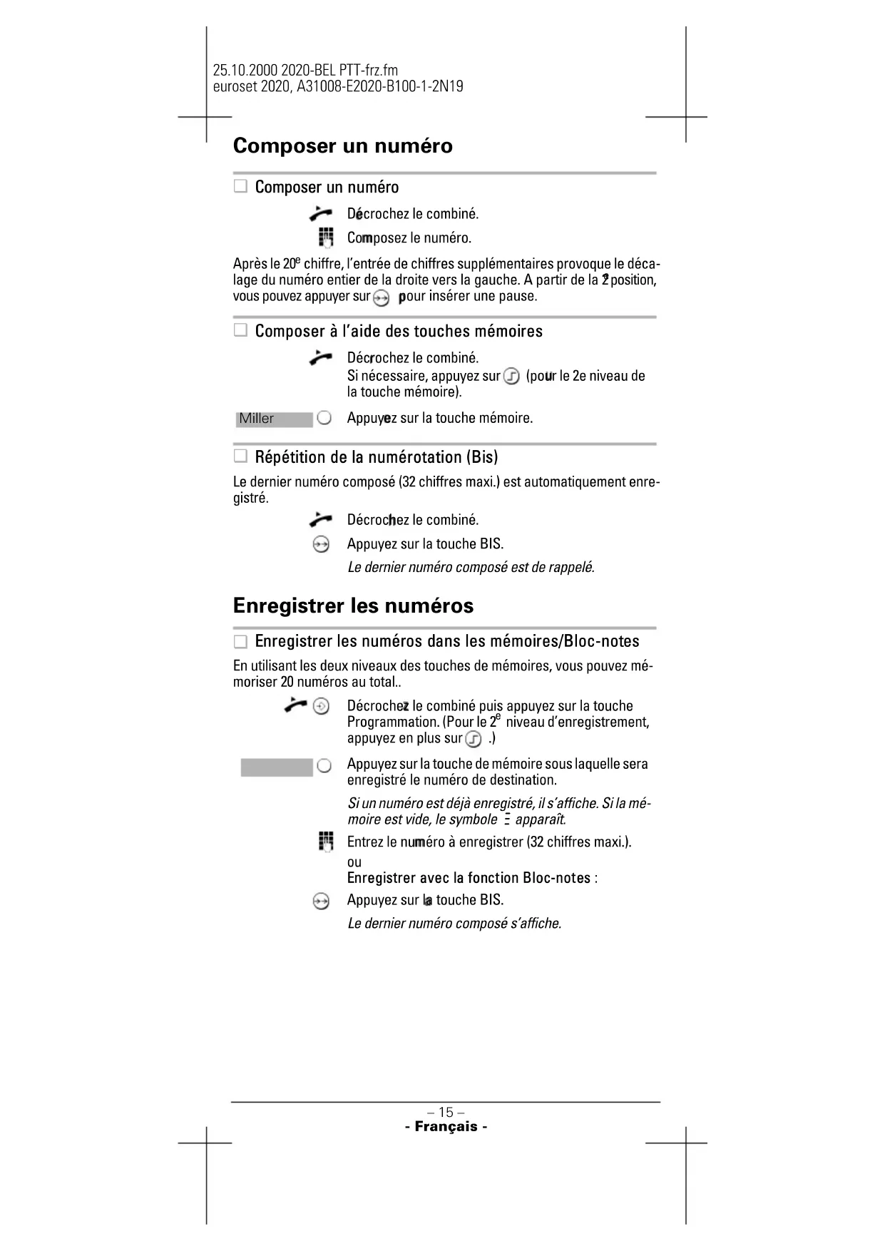 Enregistrer avec la fonction Bloc-notes : Appuyez sur la touche BIS. Le dernier numéro composé s’affiche. Miller25.10.2000 2020-BEL PTT-frz.fm euroset 2020, A31008-E2020-B100-1-2N19 – 16 – - Français - A l’aide de la touche vous pouvez insérer une pause (sauf en 1