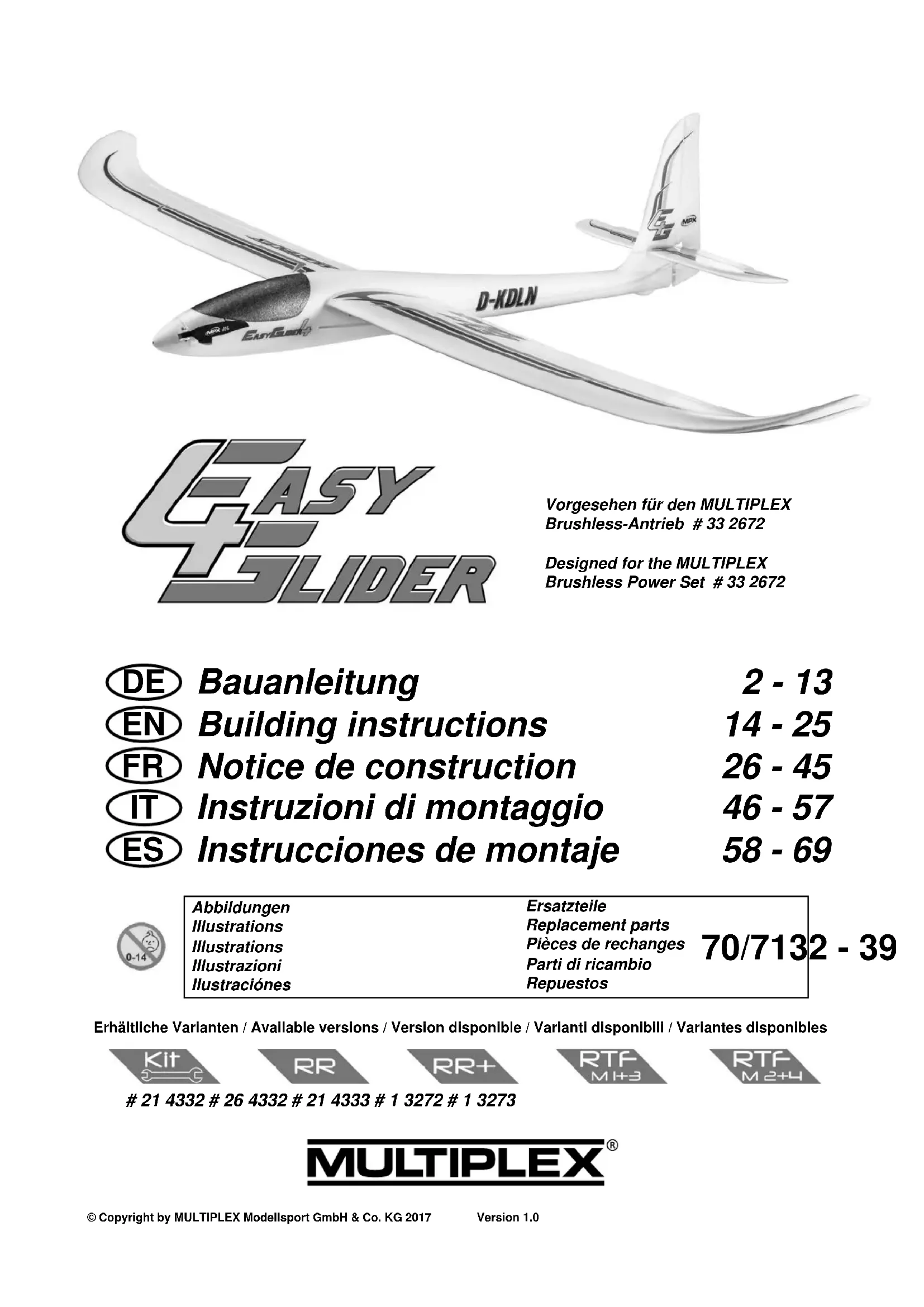 Model ying is a fascinating hobby, and an extremely rewarding way of spending your leisure time. You can look forward to many pleasurable hours spent in natural surroundings, enjoying the excellent performance and good-natured handling of your Ea- syGlider 4! All of us in the MULTIPLEX team hope you have many hours of pleasure building and ying your new model. MULTIPLEX Modellsport GmbH & Co. KG25 Parts List KIT EasyGlider 4 # 21 4332 No. Quantity Description Material Dimensions 1 1 Building instructions, KIT Paper 900 x 400 mm 2 1 Complaint processing form Paper DIN A4 3 1 Decal sheet Adhes. lm Ready made 4 1 L.H. fuselage shell ELAPOR Ready made 5 1 R.H. fuselage shell ELAPOR Ready made 6 1 Canopy ELAPOR Ready made 7 1 L.H. wing panel ELAPOR Ready made 8 1 R.H. wing panel ELAPOR Ready made 9 1 Tailplane ELAPOR Ready made 10 1 Fin ELAPOR Ready made 11 1 Fin fairing ELAPOR Ready made 12 1 GRP spar GRP 10 x 10 x 1000 mm 13 1 Foam block, battery retention Foam 30 x 30 x 100 mm Small parts set 20 2 Hook-and-loop tape, hook Plastic 25 x 60 mm 21 2 Hook-and-loop tape, loop Plastic 25 x 60 mm 22 2 Pre-formed aileron pushrod Metal 1 Ø x 80 mm 23 2 Canopy latch tongue Plastic Ready made 24 2 Canopy latch Plastic Ready made 25 1 Nut Metal M5 26 1 Plastic screw Plastic M5 27 1 Allen key Metal 1.5 A/F 28 4 Grubscrew Metal M3 x 3 mm 29 4 Swivel pushrod connector Metal 6 mm Ø Plastic parts set 30 1 Tailplane mount Plastic Ready made 31 1 Fin support Plastic Ready made 32 1 Upper tailplane support Plastic Ready made 33 1 Lower tailplane support Plastic Ready made 34 1 Fuselage-mounted rudder hinge Plastic Ready made 35 1 Bottom rudder hinge Plastic Ready made 36 1 Elevator horn Plastic Ready made 37 2 Aileron horn Plastic Ready made 38 2 Fin end-piece Plastic Ready made 39 1 Motor mount Plastic Ready made 40 1 Canopy nger-grip Plastic Ready made 41 2 Cable holder Plastic Ready made 42 2 Fuselage cover plate Plastic Ready made 43 1 L.H. aileron servo fairing Plastic Ready made 44 1 R.H. aileron servo fairing Plastic Ready made 45 2 Spar end-piece Plastic Ready made 46 2 plastic sleeve Plastic 3/2 OD/ID x 20 mm Rod and tube set 50 2 Pre-formed wire pushrod Metal 0.8 Ø x 875 mm 51 2 Snake inner sleeve Plastic 2/1 OD/ID x 850 mm 52 2 Snake outer sleeve Plastic 3/2 OD/ID x 785 mm 53 2 Aileron spar Metal 3 Ø x 250 mm 54 1 Upper GRP stiffener GRP 1.3 Ø x 680 mm 55 1 Lower GRP stiffener GRP 1.3 Ø x 740 mm Propeller set 60 1 Taper collet set, complete Metal For 4 mm Ø shaft 61 1 Propeller hub Metal Ready made 62 1 Spinner Plastic Ready made 63 2 Folding propeller blade Plastic 9 x 6‘‘ / 23 x 15 cm 64 1 Plain washer Metal 16/8.4 mm OD/ID 65 1 Shake-proof washer Metal 8.4 mm Ø 66 1 Flat nut Metal M8 67 2 M3 cheesehead screw Metal M3 x 20 mm 68 2 M3 self-locking nut Metal M3 69 1 Mushroom-head screw Metal M2.5 x 12 mm26 Consignes de sécurités pour les modèles volants MULTIPLEX Le modèle n’est PAS UN JOUET. En utilisant ce modèle, le propriétaire de celui-ci déclare avoir pris connaissance du contenu de la notice d’utilisation, particulièrement concernant les consignes de sécurités, l’entretien ainsi que les restrictions et défauts d’utilisations, et qu’il a bien compris le sens de ces consignes Ce modèle ne doit pas être utilisé par des enfants de moins de 14 ans. Si des personnes mineures devaient utiliser ce modèle sous la surveillance d’une personne responsable, au sens légal du terme, et expérimentée, celui-ci porte donc la responsabilité concernant le respect des consignes contenu dans la NOTICE D’UTISATION. LE MODÈLE AINSI QUE TOUT L’ÉQUIPEMENT NÉCESSAIRE DOIT ÊTRE ÉLOIGNÉ DES ENFANTS DE MOINS DE 3 ANS! LES PARTIES AMOVIBLES DU MODÈLE PEUVENT ÊTRES AVALÉES PAR LES ENFANTS DE MOINS DE 3 ANS. DANGER D’ÉTOUFFEMENT! Lors de l’utilisation de votre modèle il est impératif de respecter toutes les indications relatives aux dangers décrits dans la NOTICE D’UTISATION. La société Multiplex Modellsport GmbH & Co. KG ne peut pas être tenue pour res- ponsable concernant la perte ou tout type d’endommagement de votre modèle résultant à un abus ou une mauvaise utilisation de ce produit, ainsi que des accessoires. Cela comprend également la perte ou les dommages directs ou indirects, ainsi que de toute forme de dommages résultants Chaque consigne de sécurité contenue dans la notice doit obligatoirement être respectée et contribue directement à une utilisation sécurisée de votre modèle. Utilisez votre modèle intelligemment et avec prudence, cela procurera beau- coup de plaisir à vous et à vos spectateurs sans pour autant les mettre en danger. Si vous n’utilisez pas correctement votre modèle, ceux-ci peut conduire à des dommages sur lui-même ou des blessures plus ou moins graves sur vous ou autrui. Vous seul êtes responsables de la transposition correcte des indications contenues dans la notice Utilisation conforme Ce modèle doit exclusivement être utilisé dans le domaine du modèle réduit. Toute utilisation dans un autre domaine est absolument interdite. Pour tout dommage ou blessure sur des personnes ou des animaux résultant d’une utilisa- tion non conforme, c’est l’utilisateur qui en porte la responsabilité et non le fabricant. N’utilisez votre modèle qu’avec les accessoires conseillés. Les composants/accessoires conseillés sont testés sur leur fonctionnalité et compatibilité par rapport au modèle. Si vous deviez en utiliser d’autres ou modier le modèle, vous utiliserez celui-ci à vos risques et périls, sans oublier que les différentes garanties constructeur / revendeur ne sont plus valables. An de minimiser les risques lors de l’utilisation de votre modèle, il est important de respecter les points suivants: Le modèle est piloté au travers d’un émetteur. Malheureusement aucun émetteur n’est à l’abri de problèmes d’émissions. Ce genre de perturbations peut entraîner une perte momentan