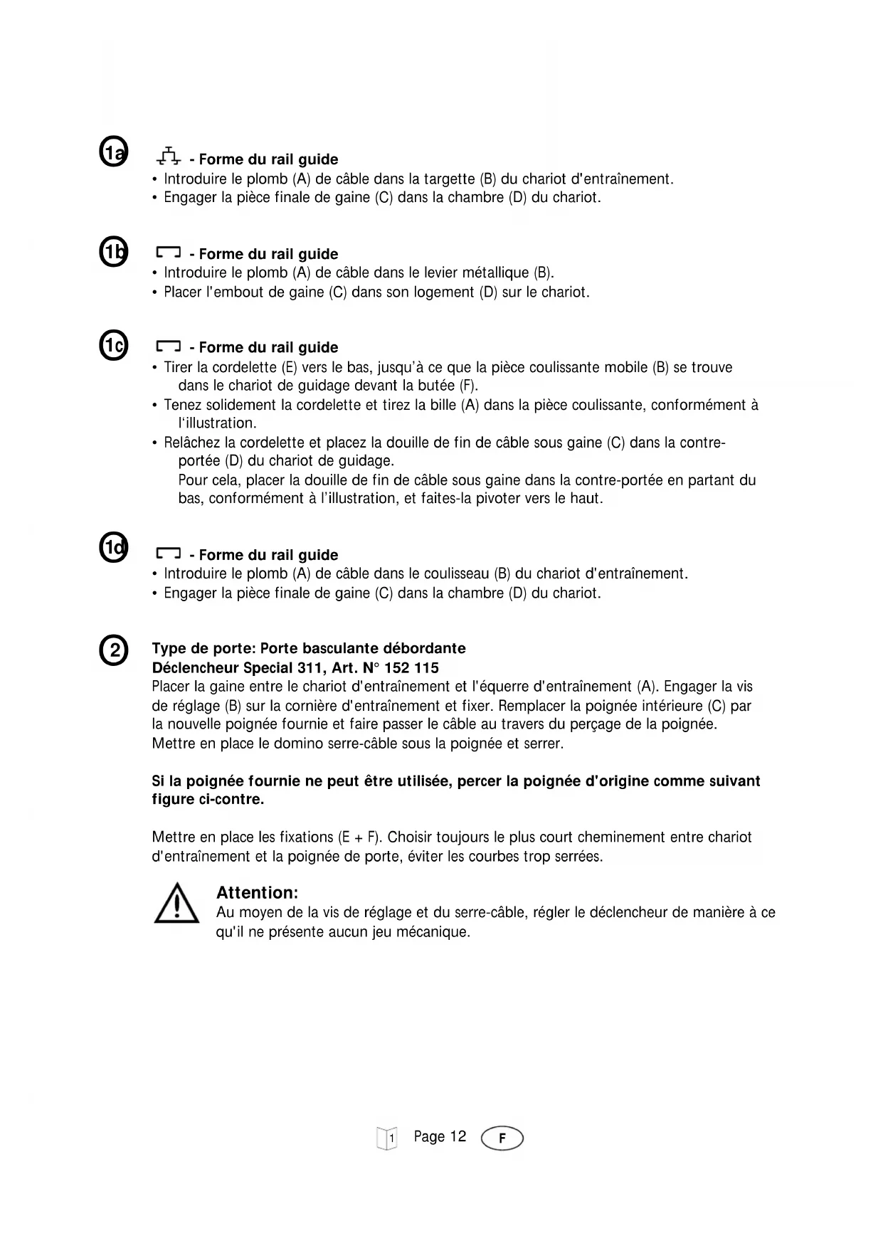 Type de porte: Porte basculante débordante Déclencheur Special 311, Art. N° 152 115 Placer la gaine entre le chariot d'entraînement et l'équerre d'entraînement (A). Engager la vis de réglage (B) sur la cornière d'entraînement et fixer. Remplacer la poignée intérieure (C) par la nouvelle poignée fournie et faire passer le câble au travers du perçage de la poignée. Mettre en place le domino serre-câble sous la poignée et serrer. Si la poignée fournie ne peut être utilisée, percer la poignée d'origine comme suivant figure ci-contre. Mettre en place les fixations (E + F). Choisir toujours le plus court cheminement entre chariot d'entraînement et la poignée de porte, éviter les courbes trop serrées. Attention: Au moyen de la vis de réglage et du serre-câble, régler le déclencheur de manière à ce qu'il ne présente aucun jeu mécanique. - Forme du rail guide