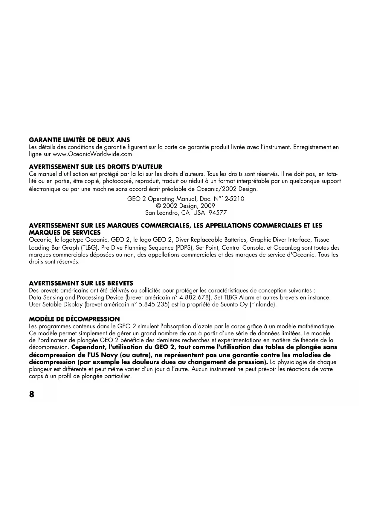 Ce manuel d'utilisation est protégé par la loi sur les droits d'auteurs. Tous les droits sont réservés. Il ne doit pas, en tota- lité ou en partie, être copié, photocopié, reproduit, traduit ou réduit à un format interprétable par un quelconque support électronique ou par une machine sans accord écrit préalable de Oceanic/2002 Design. GEO 2 Operating Manual, Doc. N°12-5210 © 2002 Design, 2009 San Leandro, CA USA 94577 AVERTISSEMENT SUR LES MARQUES COMMERCIALES, LES APPELLATIONS COMMERCIALES ET LES