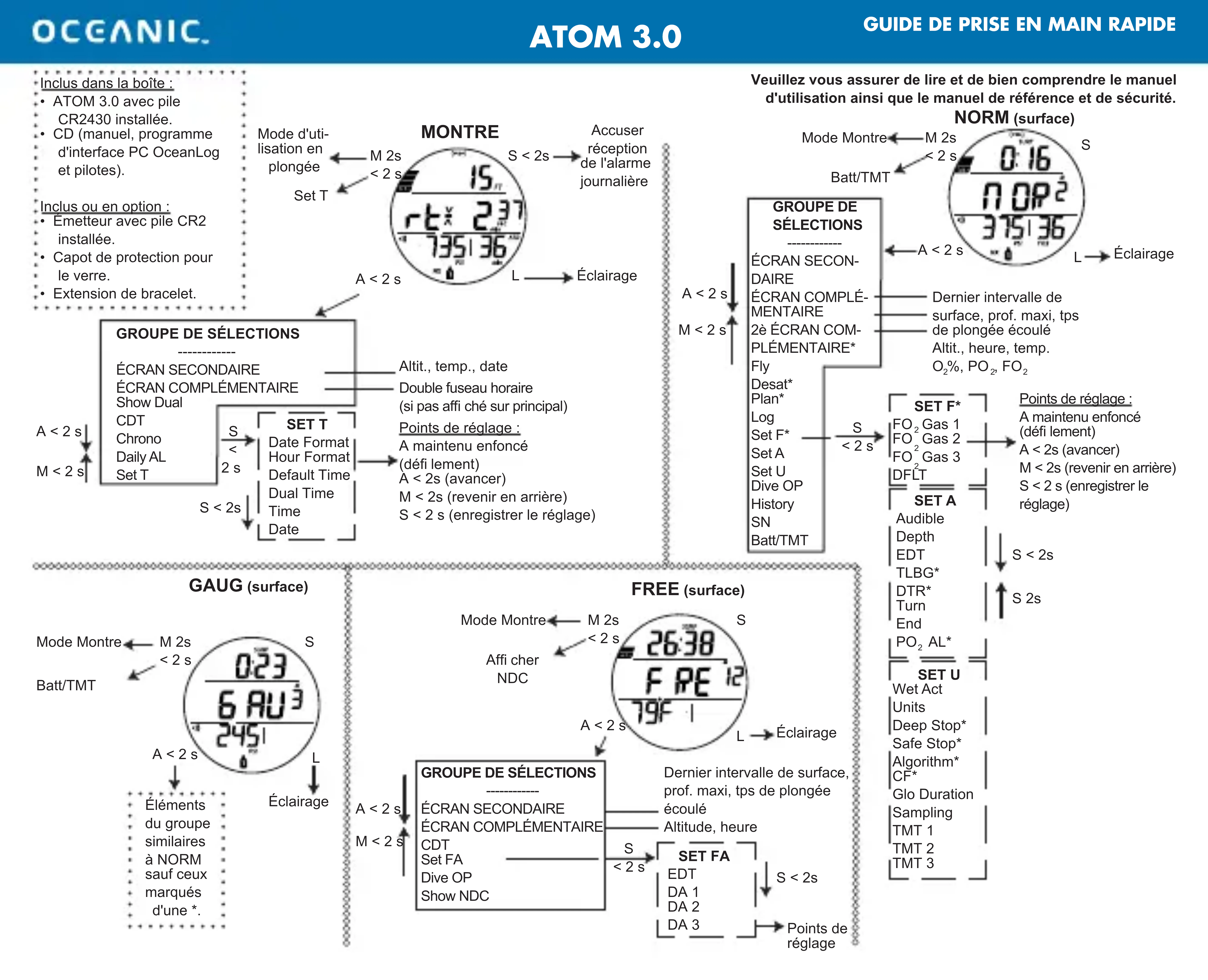 Gas/TMT 1 Gas/TMT 2 Gas/TMT 3 Changement/ Confi rmer << ou >> Démarrer/ arrêter minuteur Réinitialiser minuteur Écran principal plongée sans décompression Accuser réception des alarmes Éclairage Défi ni avec minuteur M 2s S < 2s