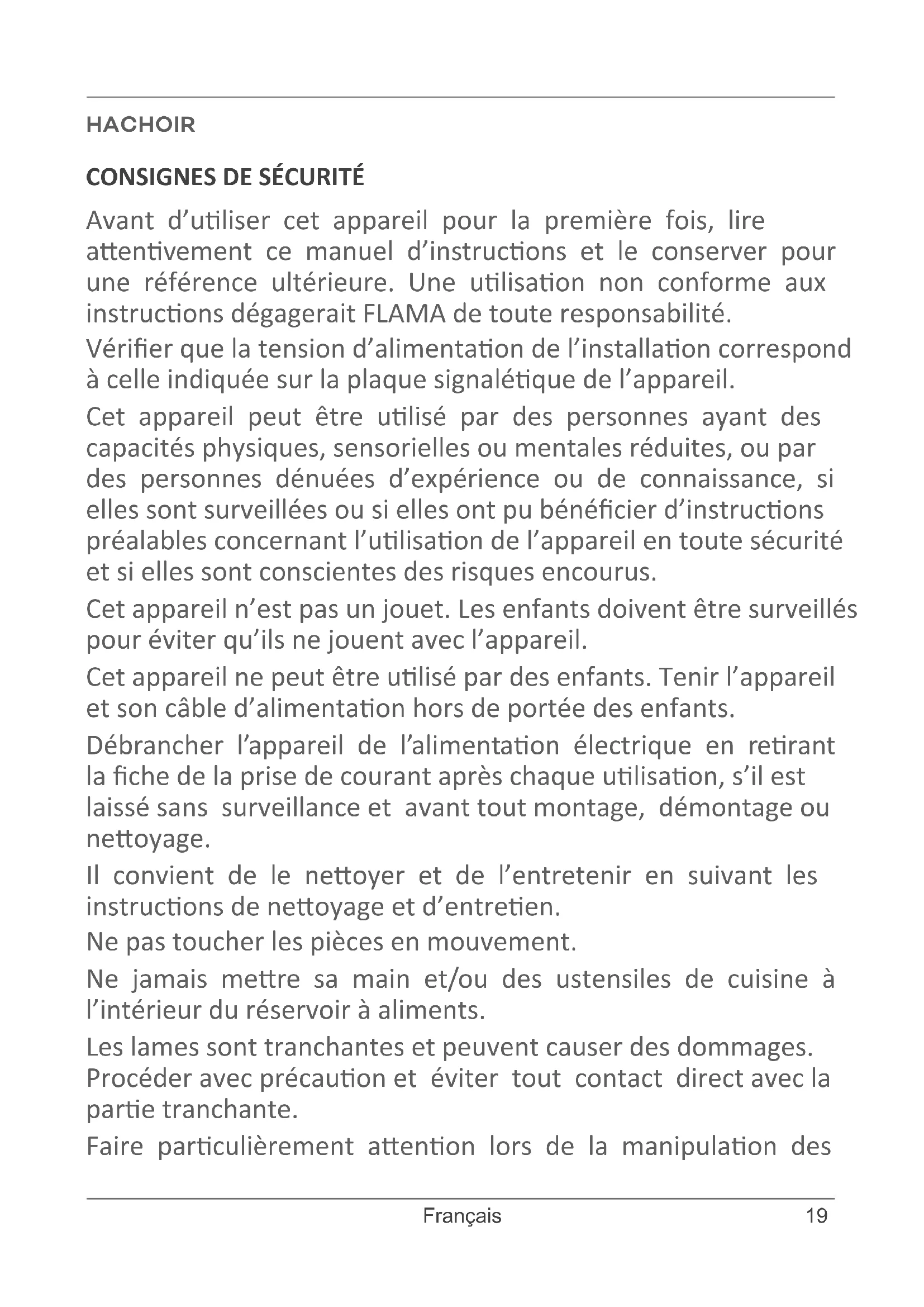 Avant d’uliser cet appareil pour la première fois, lire aenvement ce manuel d’instrucons et le conserver pour une référence ultérieure. Une ulisaon non conforme aux instrucons dégagerait FLAMA de toute responsabilité. Vérier que la tension d’alimentaon de l’installaon correspond à celle indiquée sur la plaque signaléque de l’appareil. Cet appareil peut être ulisé par des personnes ayant des capacités physiques, sensorielles ou mentales réduites, ou par des personnes dénuées d’expérience ou de connaissance, si elles sont surveillées ou si elles ont pu bénécier d’instrucons préalables concernant l’ulisaon de l’appareil en toute sécurité et si elles sont conscientes des risques encourus. Cet appareil n’est pas un jouet. Les enfants doivent être surveillés pour éviter qu’ils ne jouent avec l’appareil. Cet appareil ne peut être ulisé par des enfants. Tenir l’appareil et son câble d’alimentaon hors de portée des enfants. Débrancher l’appareil de l’alimentaon électrique en rerant la che de la prise de courant après chaque ulisaon, s’il est laissé sans surveillance et avant tout montage, démontage ou neoyage. Il convient de le neoyer et de l’entretenir en suivant les instrucons de neoyage et d’entreen. Ne pas toucher les pièces en mouvement. Ne jamais mere sa main et/ou des ustensiles de cuisine à l’intérieur du réservoir à aliments. Les lames sont tranchantes et peuvent causer des dommages. Procéder avec précauon et éviter tout contact direct avec la pare tranchante. Faire parculièrement aenon lors de la manipulaon des20 www.ama.pt lames, lors du montage et du démontage, lors de la vidange du réservoir et lors du neoyage. ATTENTION : Ne pas introduire d’ingrédients chauds dans le réservoir. Avant de préparer les aliments, les laisser refroidir pendant quelques minutes. Faire très aenon au moment de manipuler des aliments chauds, car vous pourriez vous brûler. Ne pas remplir complètement le réservoir. Vider le réservoir lors de son neoyage. Cet appareil a été conçu pour une ulisaon maximale de 10 secondes en connu. Lorsque cee limite est dépassée, faire une pause de 1 minute pour le refroidir avant de le réuliser pour éviter de surcharger le moteur. Ne pas uliser cet appareil pour mélanger des aliments ou des substances gluneuses comme la conture ou la marmelade. Ne pas broyer des aliments trop durs (noix de muscade, légumes secs, viande avec os, sucre, café, glaçons). Ne pas uliser l’appareil s’il ne fonconne pas correctement. Toujours éteindre l’appareil avant de changer d’accessoire ou de manipuler des pièces qui sont en mouvement pendant l’ulisaon. Si le câble d’alimentaon est endommagé, demander au service d’assistance technique agréé FLAMA de le remplacer an d’éviter tout danger. Toute opéraon autre que le neoyage ne doit être eectuée que par des agents agréés FLAMA. Ce produit est conforme aux direcves concernant la compabilité électromagnéque et la basse tension. Ce manuel d’instrucons est également disponible en format PDF sur www.ama.pt.21 Français DESCRIPTION