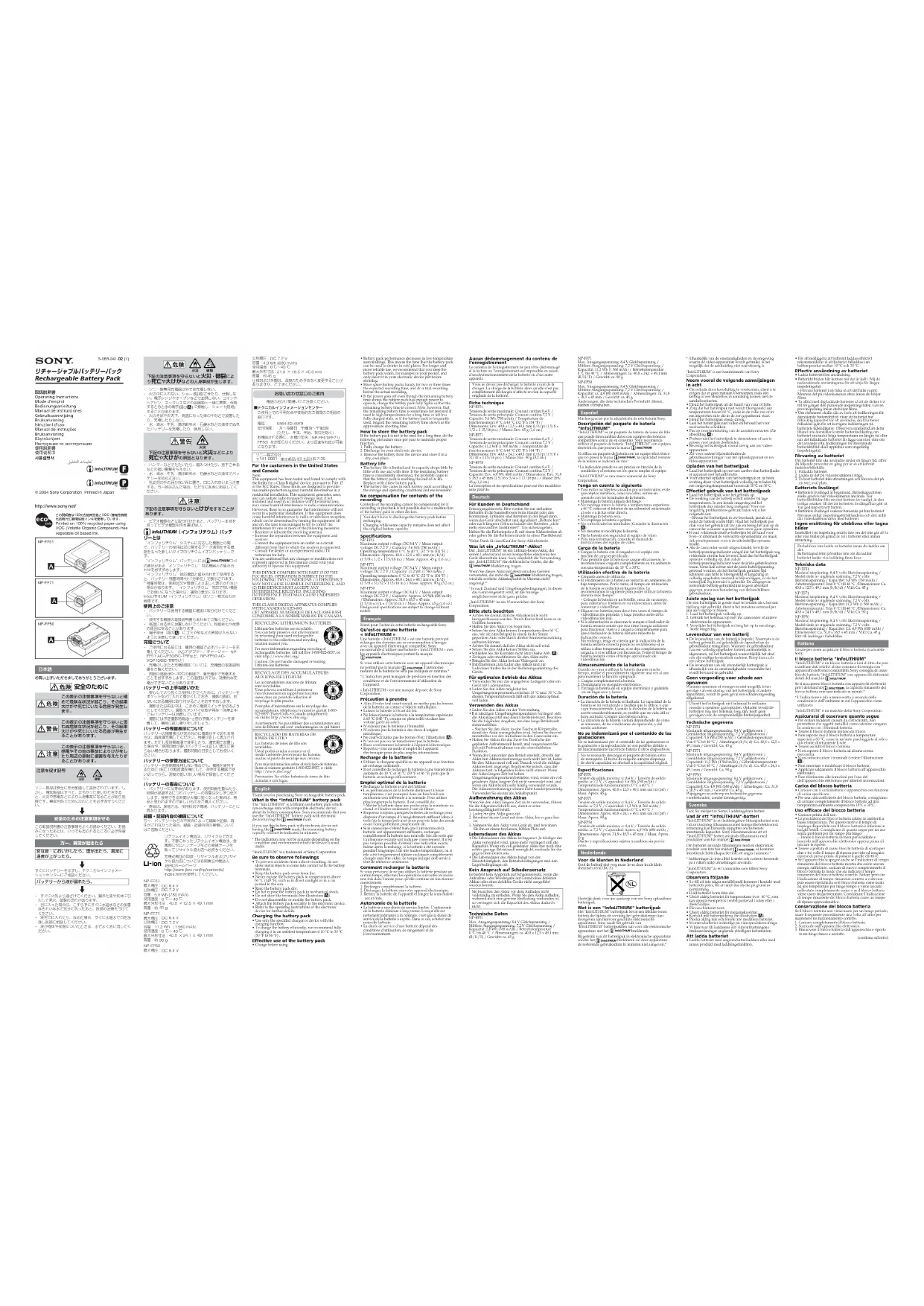 - The battery life is limited and its capacity drops little bylittle with use and with time. If the remaining batterytime is considerably shortened, the probable cause isthat the battery pack is reaching the end of its life.Replace with a new battery pack.• The battery life varies in each battery pack according tothe storage and operating conditions and environment. No compensation for contents of the recording Contents of the recording cannot be compensated for ifrecording or playback is not possible due to a malfunctionof the battery pack or other devices.You don’t have to discharge the battery pack beforerecharging.Charging while some capacity remains does not affectthe original battery capacity. Specifications NP-FF51Maximum output voltage: DC 8.4 V / Mean outputvoltage: DC 7.2 V / Capacity: 5.6 Wh (780 mAh) /Operating temperature: 0 °C to 40 °C (32 °F to 104 °F) / Dimensions: Approx. 40.8 × 12.5 × 49.1 mm (w/h/d) (1 5/8 × 1/2 × 1 15/16 in.) / Mass: Approx. 45 g (1.6 oz.)NP-FF71Maximum output voltage: DC 8.4 V / Mean outputvoltage: DC 7.2 V / Capacity: 11.2 Wh (1 560 mAh) /Operating temperature: 0 °C to 40 °C (32 °F to 104 °F) / Dimensions: Approx. 40.8 × 24.1 × 49.1 mm (w/h/d) (1 5/8 × 31/32 × 1 15/16 in.) / Mass: Approx. 90 g (3.2 oz.)NP-FP50Maximum output voltage: DC 8.4 V / Mean outputvoltage: DC 7.2 V / Capacity: Approx. 4.9 Wh (680 mAh) / Dimensions: Approx. 31.8 × 18.5 × 45 mm (1 5/16 × 3/4 × 1 13/16 in.) / Mass: Approx. 45 g (1.6 oz.)Design and specifications are subject to change withoutnotice.FrançaisMerci pour l’achat de cette batterie rechargeable Sony. Qu’est-ce qu’une batterie « InfoLITHIUM » Une batterie « InfoLITHIUM » est une batterie pouvantéchanger des données sur sa consommation d’énergieavec un appareil électronique compatible. Sonyrecommande d’utiliser une batterie « InfoLITHIUM » avecles appareils électroniques portant la marque Si vous utilisez cette batterie avec un appareil électroniquene portant pas la marque , l’autonomierestante de la batterie ne sera pas indiquée en minutes.** L’indication peut manquer de précision en fonction desconditions et de l’environnement d’utilisation del’appareil.« InfoLITHIUM » est une marque déposée de SonyCorporation. Précaution à prendre