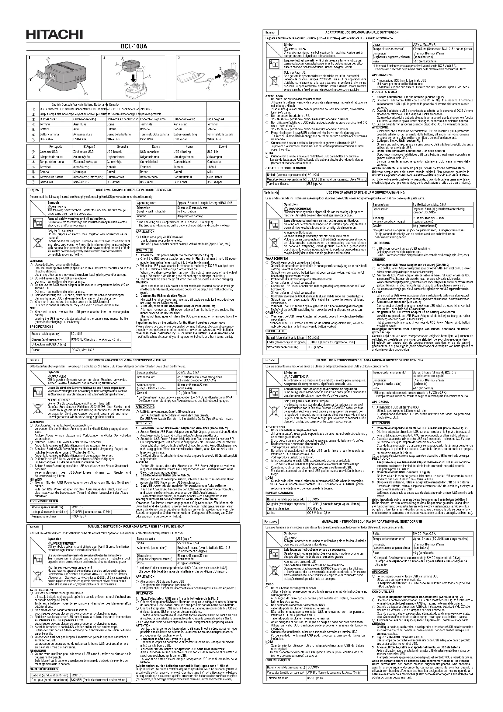 Después de utilizarlo, retire el adaptador-alimentador USB de la batería y sustituya la tapa de goma en el terminal USB. La lámpara de potencia se apaga cuando el adaptador-alimentador USB se retira de la batería. Aviso importante sobre las pilas de las herramientas inalámbricas de Hitachi Utilice siempre una de nuestras pilas genuinas. No podemos garantizar la seguridad y el funcionamiento de nuestra herramienta eléctrica inalámbrica cuando se utiliza con pilas diferentes a las indicadas por nosotros o cuando la pila se desmonta y modifi ca (como cuando se desmontan y sustituyen celdas u otras piezas internas). Français MANUEL D’INSTRUCTION POUR ADAPTATEUR USB SANS FIL BCL-10UA Veuillez lire attentivement les instructions suivantes avant toute opération afi n d’utiliser correctement l’adaptateur USB sans fi l. Symboles AVERTISSEMENT Les symboles suivants sont utilisés pour l’outil. Bien se familiariser avec leur signifi cation avant d’utiliser l’outil. Lire tous les avertissements de sécurité et toutes les instructions. Tout manquement à observer ces avertissements et instructions peut engendrer des chocs électriques, des incendies et/ou des blessures graves. Pour les pays européens uniquement Ne pas jeter les appareils électriques dans les ordures ménagères! Conformément à la directive européenne 2002/96/EG relative aux déchets d’équipements électriques ou électroniques (DEEE), et à sa transposition dans la législation nationale, les appareils électriques doivent être collectés à part et être soumis à un recyclage respectueux de l’environnement. AVERTISSEMENT