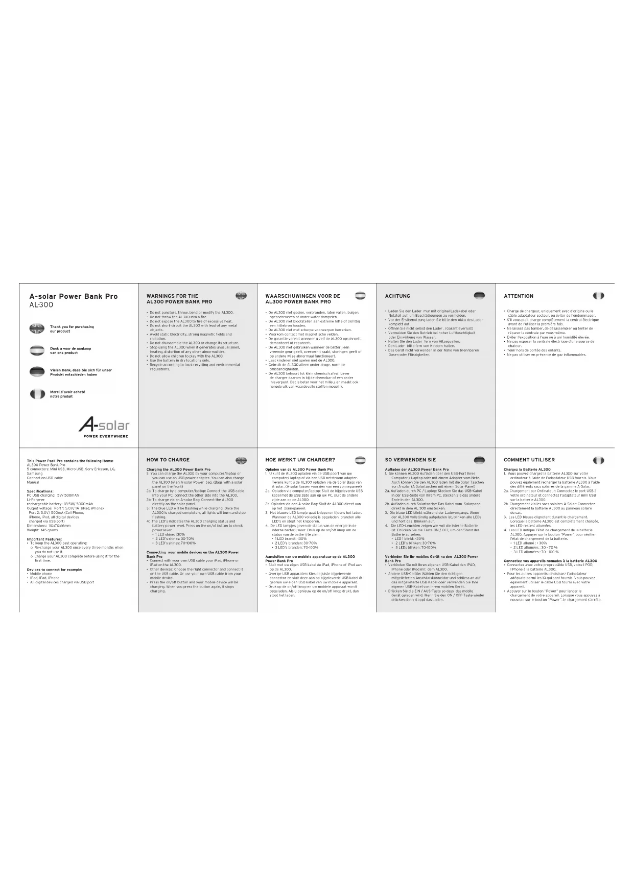 ordinateur à l’aide de l’adaptateur USB fournis. Vous pouvez également recharger la batterie AL300 à l’aide des différents sacs solaires de la gamme A-Solar. 2a. Chargement par Ordinateur: Connectez le port USB à votre ordinateur et connectez l’adaptateur mini USB sur la batterie AL300. 2b. Chargement via les sacs solaires A-Solar: Connectez directement la batterie AL300 au panneau solaire du sac.